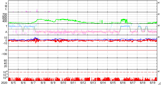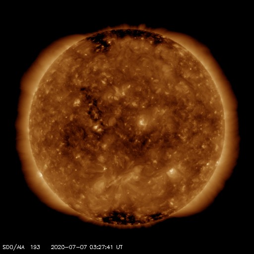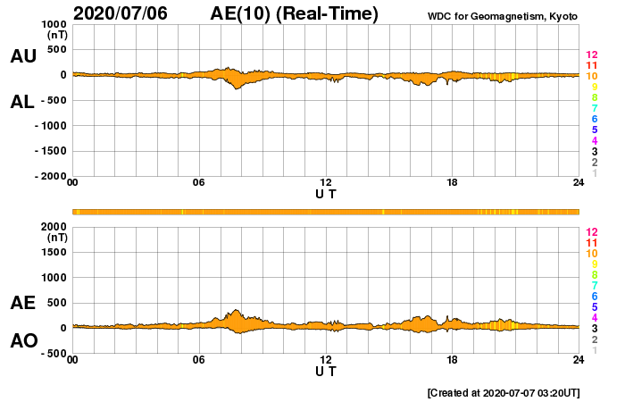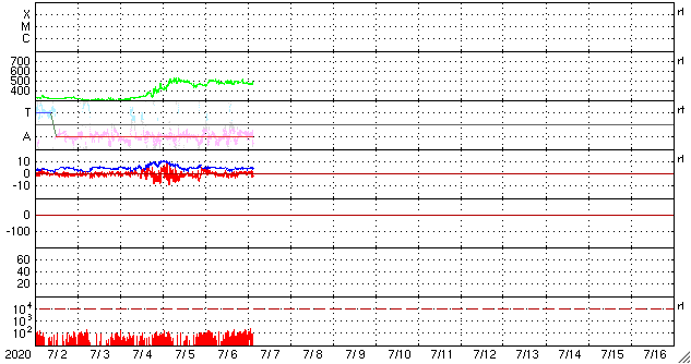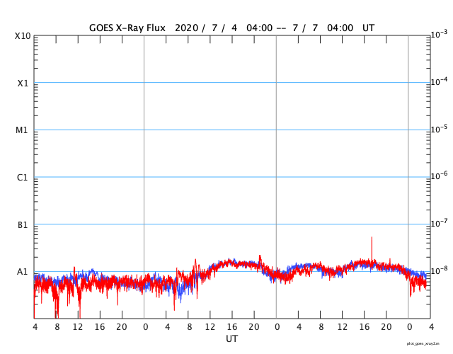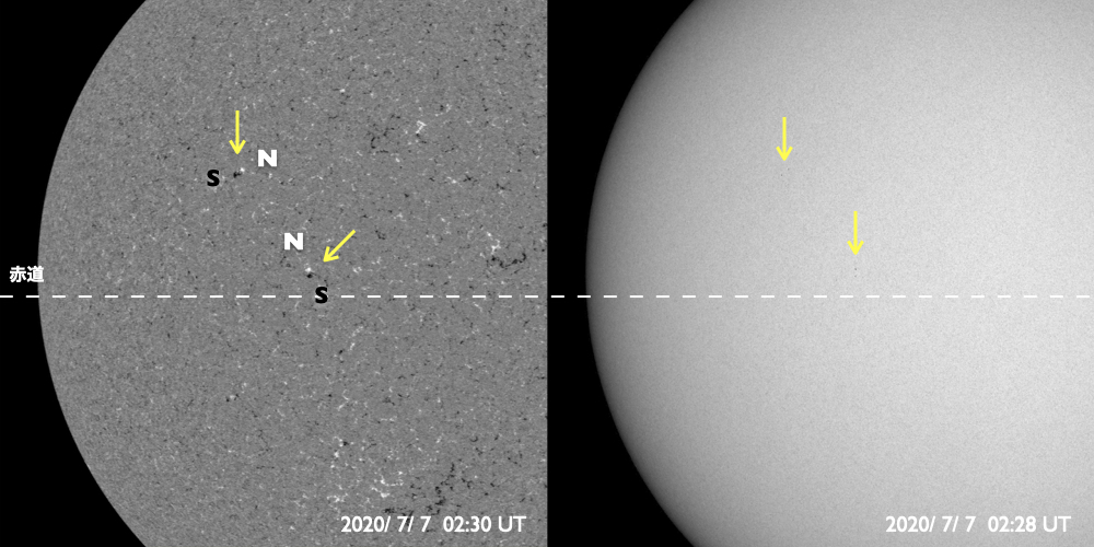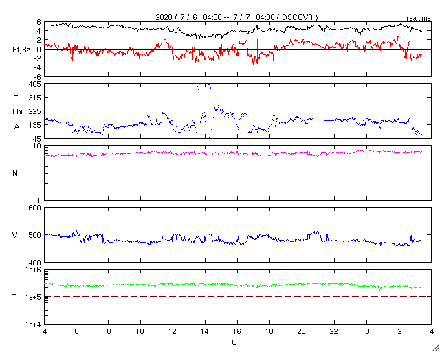 2020/ 7/ 7 12:36 更新 太陽に小さい黒点が2か所発生しています。太陽風はやや高速です。 担当 篠原 2766黒点群の黒点は、SDO衛星の画像では、 今日の未明くらいに見えなくなりました。 それと入れ替わるように、 東側(左側)の2か所に小さい黒点が発生しています。 1つは、北緯4度程度と赤道近くに現れていて、 古い第24期の黒点だと思われます。 磁場の並びは、南北に近い状態ですが、 若干、左にN極、右にS極と並んでいるようで、 これは第24期の順番です。 もうひとつは、北緯18度とやや高めで、 磁場の並びも左にS極、右にN極と、新しい第25期の順番です。 掲載の可視光写真では、 どちらにも小さい黒点が2個見えています。 黒点の出現頻度が上がってきたのでしょうか。 X線グラフは特に変化はなく、穏やかな状態です。 太陽風は、速度が500km/秒から470km/秒に少し下がり、 やや高速くらいの状態です。 磁場強度は、4〜5nTと平均的な値です。 磁場の南北成分は、0nT前後で小さく変化する程度です。 磁気圏は穏やかで、AE指数は小規模の変化が見られる程度です。 太陽風速度の高まりは、2日ほど続いています。 前周期はもう2日ほど続きましたが、今回はどうなるでしょうか。 ![]() 太陽の2か所に現れた新しい黒点。SDO衛星の磁場と可視光写真。 (c) SDO (NASA)、作図:宇宙天気ニュース ![]() SDO衛星のAIA193カメラによる太陽コロナの様子 (c) SDO (NASA) ![]() SDO衛星による太陽の可視光写真。マウスの矢印を写真に重ねると、黒点番号付きの写真に切り替わります。 (c) SDO (NASA) ![]() GOES衛星の太陽X線強度。赤・橙 = 0.1〜0.8 nm、青・紫 = 0.05〜0.4 nm (c) データ:NOAA/SWPC、作図:宇宙天気ニュース ![]() DSCOVRが観測した太陽風の磁場(1番上の枠、黒線は全体の強度、赤線は南北成分) および、太陽風の密度(3番目の紫線)、速度(4番目の青線) (c) データ:NOAA/SWPC、作図:宇宙天気ニュース ![]() AE指数(速報値) 下段のAEグラフの値が高くなると、オーロラ活動が活発化しています。 (c) 京都大学WDC ![]() ![]() 27日の太陽周期に合わせたデータプロット 太陽が同じ面を地球に向けていた27日前の変化から、今後を予想することができます。 (c) 作図:宇宙天気ニュース