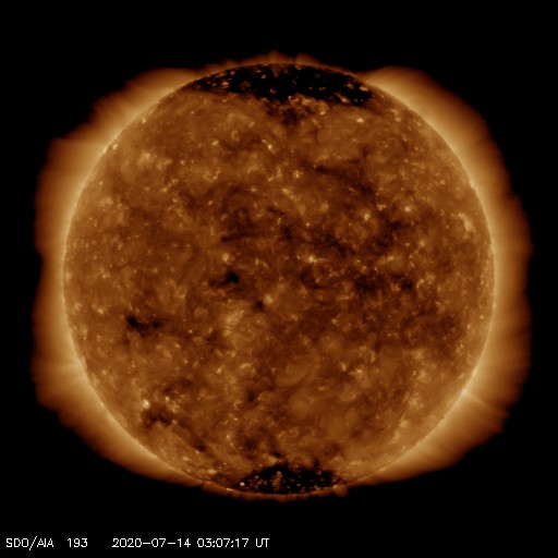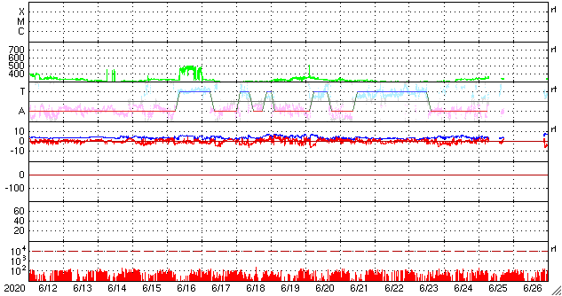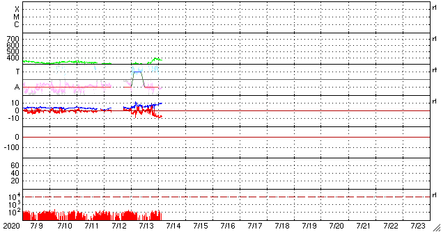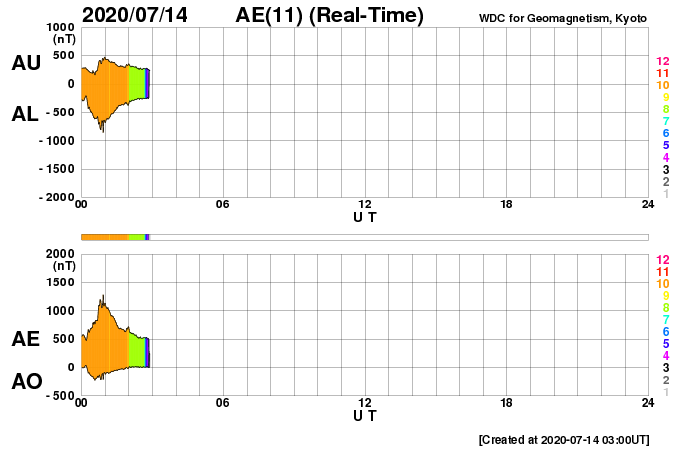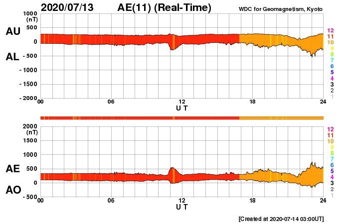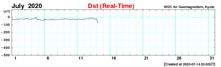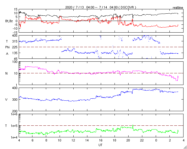 2020/ 7/14 12:22 更新 太陽風の磁場が南向きに強まり、磁気圏の活動が高まっています。 担当 篠原 今朝、14日4時(世界時13日19時)頃から、 太陽風磁場の南北成分が -5nTと南向きに変化し、 以降、-6 〜 -8nT程度になって、 現在まで南向きの状態が続いています。 磁場強度は、10nTとやや強まっています。 太陽風の速度も少し上がっていて、 昨日の300km秒から、一時、380km/秒へ上昇して、 現在は360km/秒と少し下がっています。 いずれも、低速風の範囲の変化です。 7月10日のニュースで、 太陽の西に向かって噴出するCME(コロナ質量放出)を紹介しましたが、 ほとんど同じ頃に、太陽の中央部の南側で 淡いフィラメント噴出が発生していた様で、 この時に地球の方向に飛び出したCMEの乱れが、 5日ほどかけて地球にやって来たのではないかと思います。 磁場が南向きに強まっているため、磁気圏の活動も高まっています。 AE指数は1200nTの大きい変化が起きていて、 極域ではオーロラの活動が強まっている可能性があります。 また、Dst指数の速報値は、-72nTの変化になっています。 中規模の磁気嵐が起きている様です。 (速報値なので、今後変化する可能性があります) 太陽風のグラフを見ると、南向きの磁場はピークを越えて、 戻りかけているようにも見えます。 今後、0nTに近付いて行き、その後北向きに変わる場合、 磁気圏の活動は穏やかになっていくでしょう。 引き続き、磁場の南北成分の推移に注目してください。 今回の乱れが通りすぎると、 太陽風は低速の穏やかな状態に戻りそうです。 太陽は、無黒点で穏やかな状態が続いています。