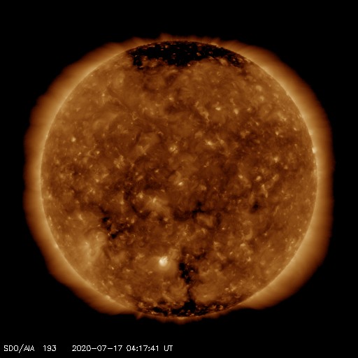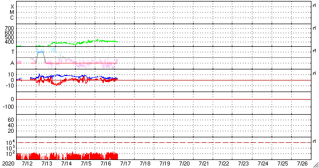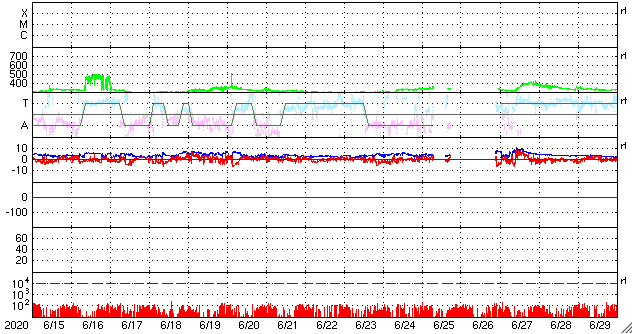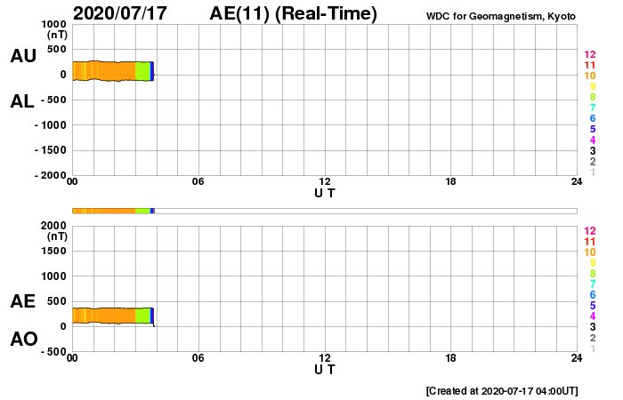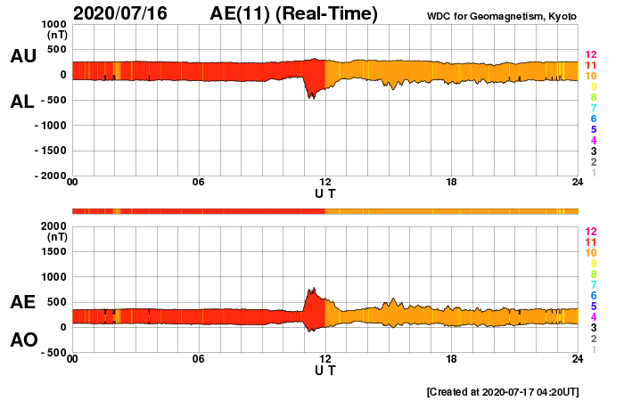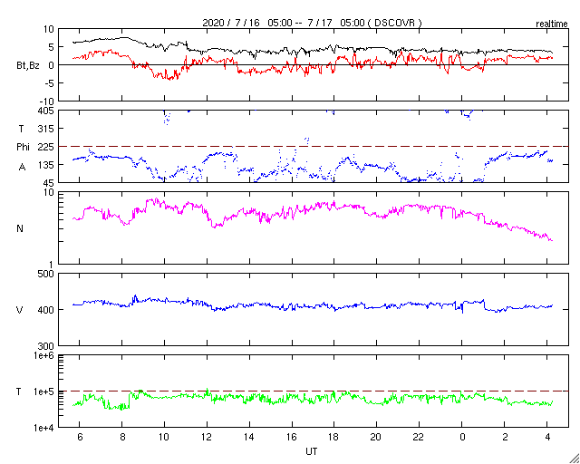 2020/ 7/17 13:26 更新 太陽風は平均的な速度が続いています。磁気圏は静穏です。 担当 篠原 太陽風の速度は、420km/秒前後で推移し、 グラフの最後で400km/秒に少し下がっています。 平均的な状態です。 磁場強度は、7nTから3nTへ下がり、やや弱くなっています。 穏やかな太陽風が続いています。 磁場の南北成分は、0nT付近で小さく変化しています。 AE指数は、変化が1回起きている程度で、 磁気圏は穏やかです。 SDO衛星AIA193の低緯度域はぼんやりと光っていて、 この後も太陽風は穏やかに推移しそうです。 太陽は、南側に見えていた小さい黒点は消えて、 無黒点です。 X線グラフも変化はなく、静かな状態が続いています。 ![]() SDO衛星のAIA193カメラによる太陽コロナの様子 (c) SDO (NASA) ![]() SDO衛星による太陽の可視光写真 (c) SDO (NASA) ![]() DSCOVRが観測した太陽風の磁場(1番上の枠、黒線は全体の強度、赤線は南北成分) および、太陽風の密度(3番目の紫線)、速度(4番目の青線) (c) データ:NOAA/SWPC、作図:宇宙天気ニュース ![]() AE指数(速報値) 下段のAEグラフの値が高くなると、オーロラ活動が活発化しています。 (c) 京都大学WDC ![]() ![]() 27日の太陽周期に合わせたデータプロット 太陽が同じ面を地球に向けていた27日前の変化から、今後を予想することができます。 (c) 作図:宇宙天気ニュース