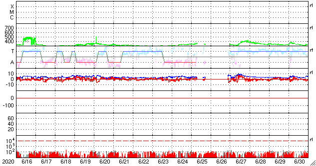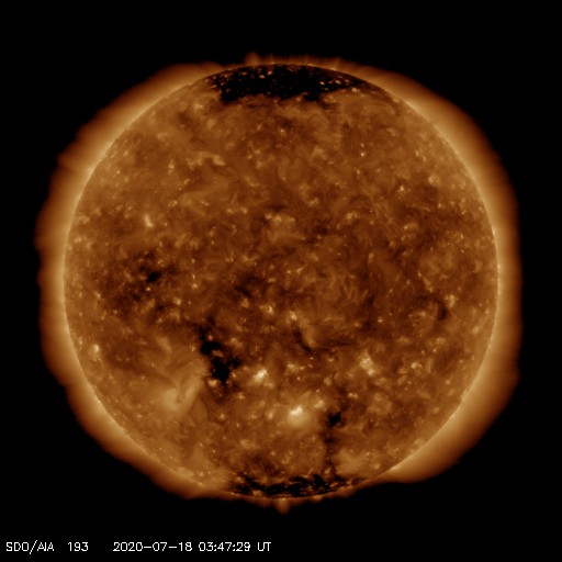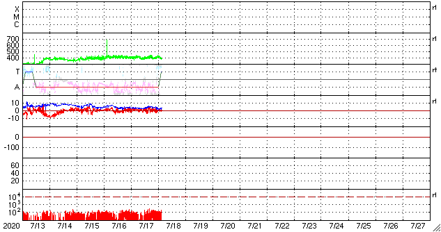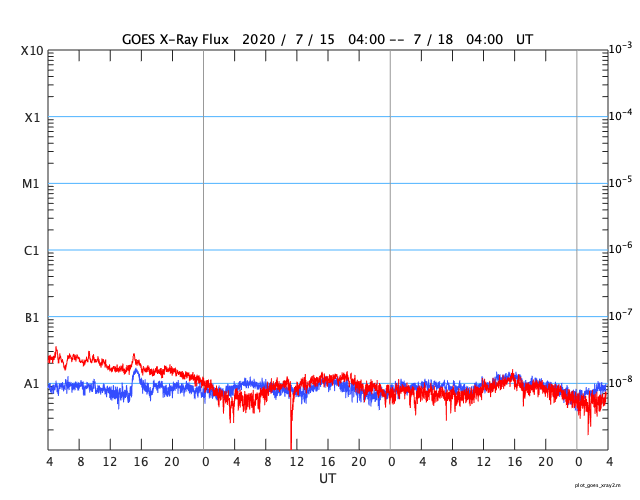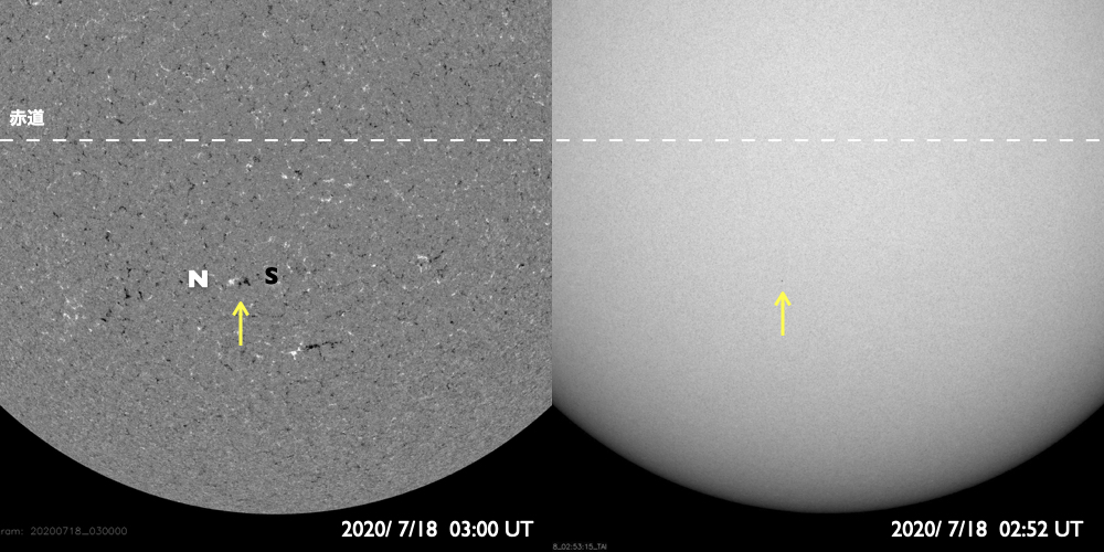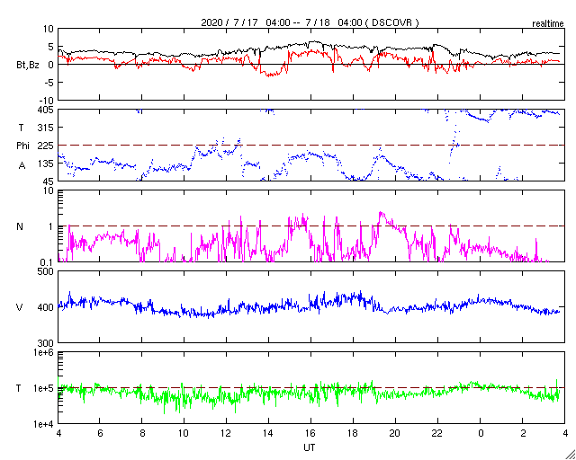 2020/ 7/18 12:58 更新 太陽に小さい黒点が現れています。太陽風は平均的な速度が続いています。 担当 篠原 太陽の南半球の中央部に小さい黒点が発生しています。 南緯20度とやや高めの緯度で、 磁場の並びは新しい第25期の順番です。 7月に入って、 新しい活動周期の小さい黒点の発生が目立っています。 本格的に新しい周期が立ち上がるのでしょうか。 X線グラフに特に変化はなく、太陽は穏やかです。 太陽風は、400km/秒と平均的な速度で安定しています。 磁場強度は、3nTから6nTに上がって、また3nTに下がっています。 やや弱い状態です。 磁場の南北成分は、0nT付近で小さく変化する程度です。 磁気圏は穏やかで、AE指数は変化の見られない状態です。 SDO衛星AIA193では、 南東側(左下)のコロナホールが少し目立っています。 4〜5日後くらいに影響が見られるかもしれません。 ![]() 太陽の南半球に現れた第25期の黒点。SDO衛星の磁場と可視光写真。 (c) SDO (NASA)、作図:宇宙天気ニュース ![]() SDO衛星のAIA193カメラによる太陽コロナの様子 (c) SDO (NASA) ![]() SDO衛星による太陽の可視光写真。マウスの矢印を写真に重ねると、黒点番号付きの写真に切り替わります。 (c) SDO (NASA) ![]() GOES衛星の太陽X線強度。赤・橙 = 0.1〜0.8 nm、青・紫 = 0.05〜0.4 nm (c) データ:NOAA/SWPC、作図:宇宙天気ニュース ![]() DSCOVRが観測した太陽風の磁場(1番上の枠、黒線は全体の強度、赤線は南北成分) および、太陽風の密度(3番目の紫線)、速度(4番目の青線) (c) データ:NOAA/SWPC、作図:宇宙天気ニュース ![]() AE指数(速報値) 下段のAEグラフの値が高くなると、オーロラ活動が活発化しています。 (c) 京都大学WDC ![]() ![]() 27日の太陽周期に合わせたデータプロット 太陽が同じ面を地球に向けていた27日前の変化から、今後を予想することができます。 (c) 作図:宇宙天気ニュース