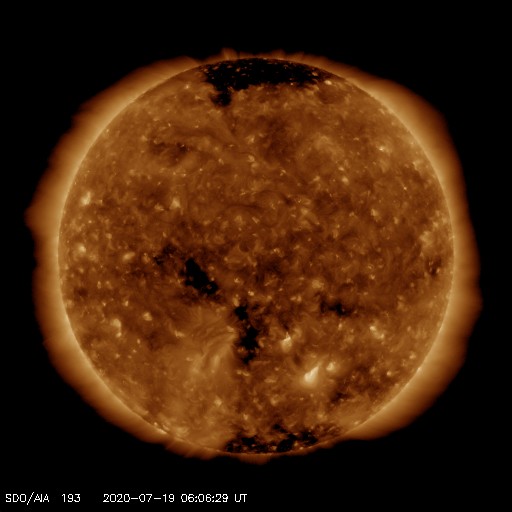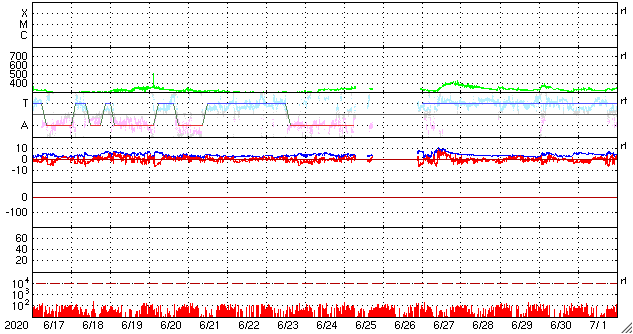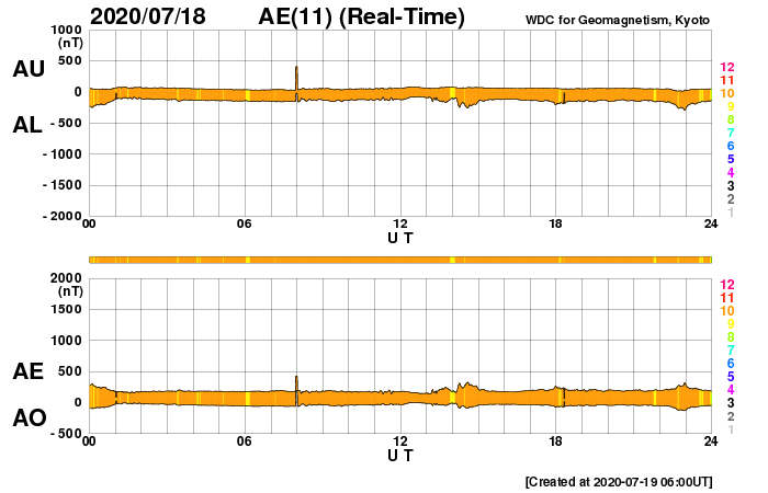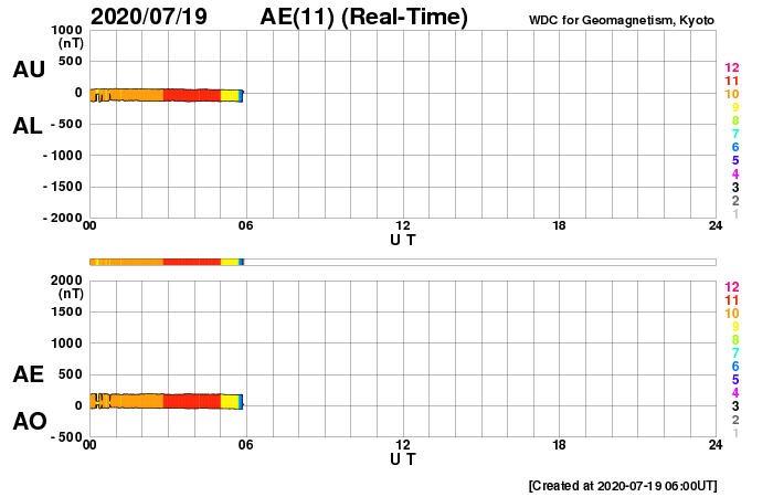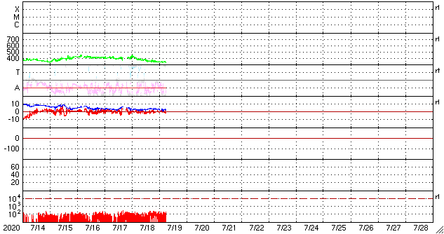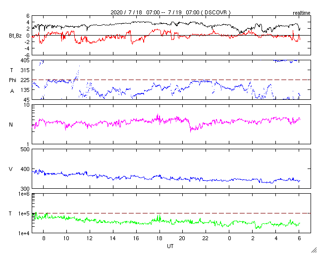2020/ 7/19 15:18 更新 太陽風は低速になっています。太陽は無黒点です。 担当 篠原 太陽風は、400km/秒から340km/秒へ速度が下がり、 低速の風に変わっています。 磁場強度は、3〜4nTとやや弱い状態です。 磁場の南北成分は、0nT付近で小さく変化する程度です。 磁気圏は穏やかで、 AE指数は特に変化は起きていません。 SDO衛星AIA193は、 太陽の中央部の南東寄りにコロナホールが見えています。 3〜4日後くらいから太陽風に影響が見られるかもしれません。 太陽は、昨日見えていた黒点は消えて、 無黒点になっています。 X線グラフも変化はなく、穏やかです。