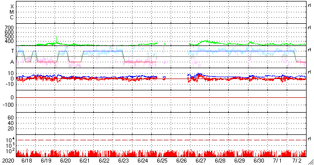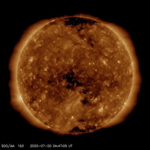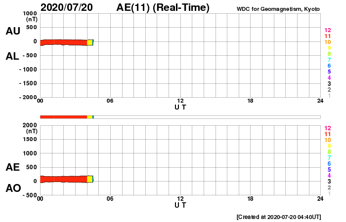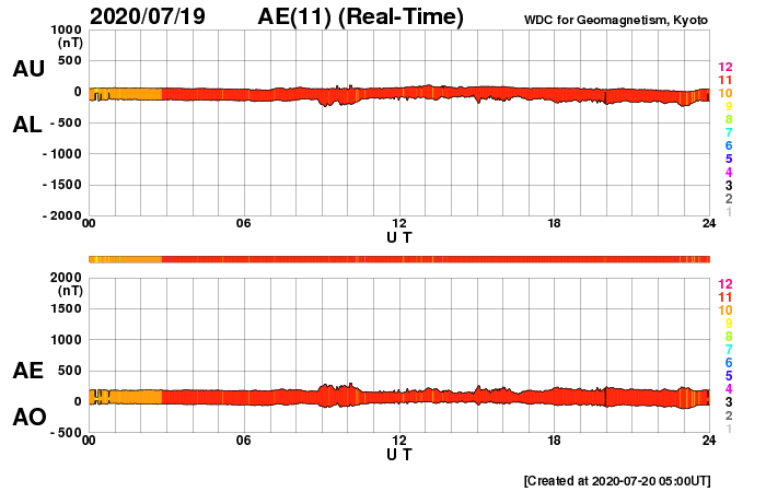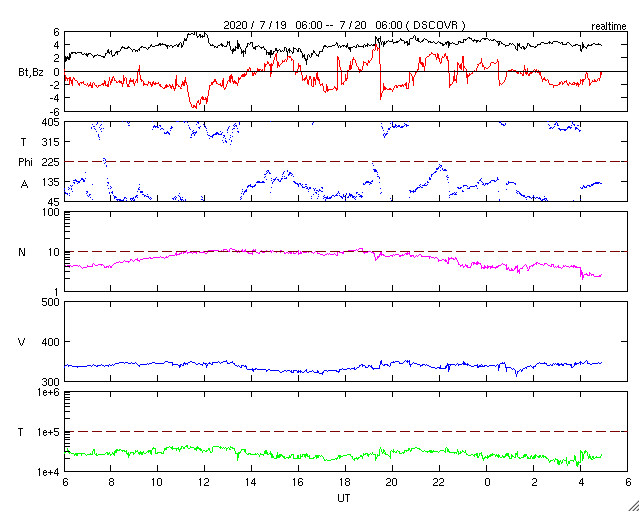 2020/ 7/20 14:02 更新 低速の太陽風が続き、磁気圏も穏やかです。 担当 篠原 太陽風は、340km/秒と低速の風が続いています。 磁場強度は、4nT前後と平均的な状態です。 磁場の南北成分は、 南北に弱い変化が見られる様になっています。 しかし、速度が下がっているため磁気圏は穏やかで、 AE指数は、細かい変化が見にくい状態が続いていますが、 目立つ程の変化は発生していません。 SDO衛星AIA193では、 太陽の中央部のコロナホールが良く見えています。 2〜3日後くらいから、 この領域の影響で太陽風の速度が高まるかもしれません。 太陽は、無黒点で穏やかな状態が続いています。