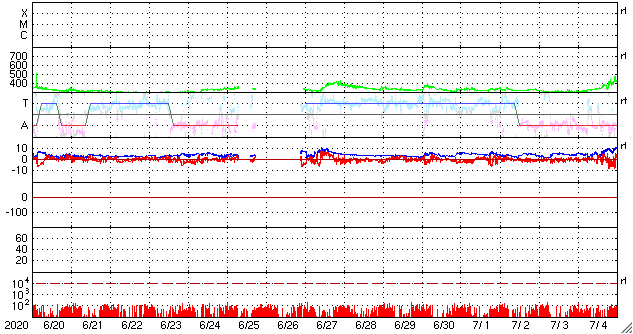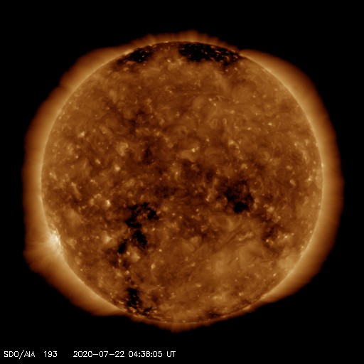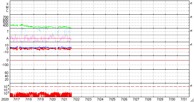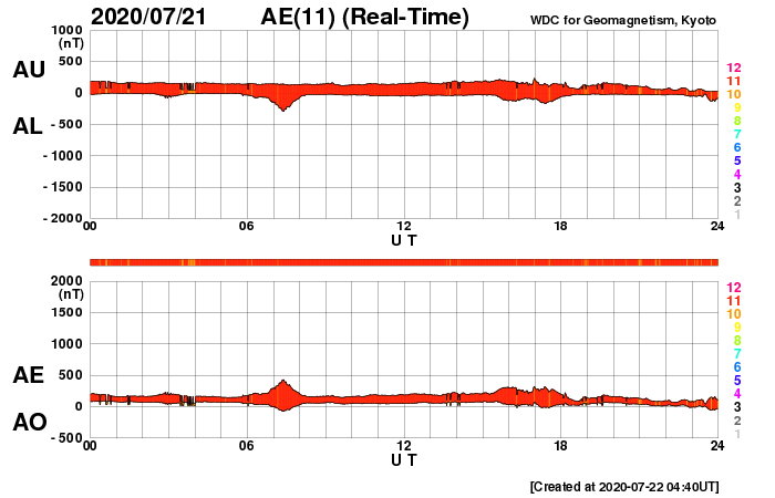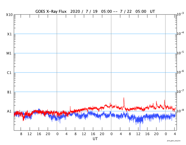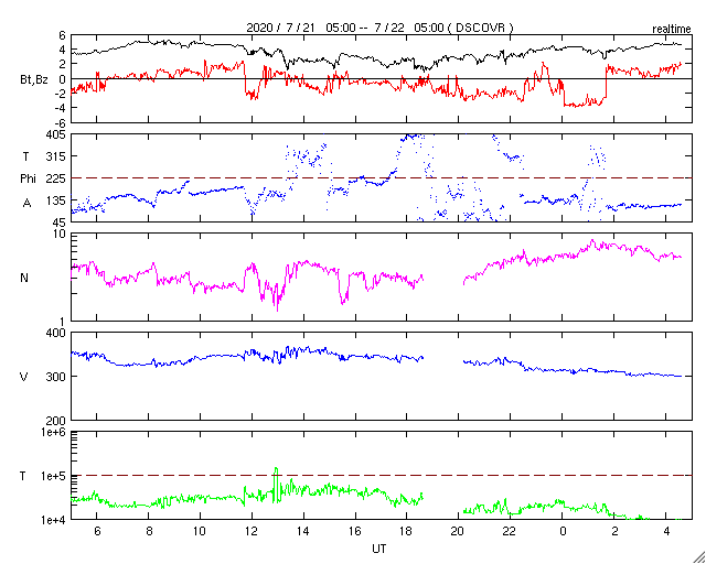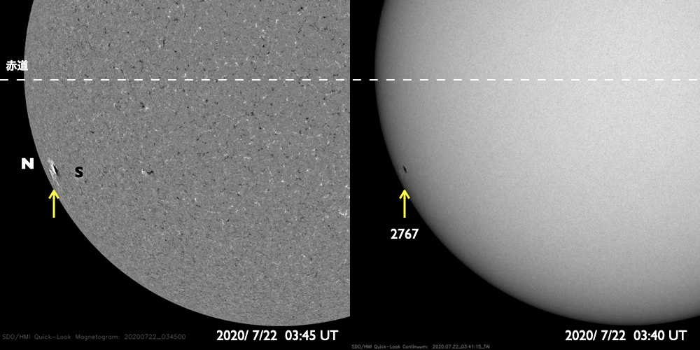 2020/ 7/22 13:45 更新 太陽の南東に新しい黒点が現れています。太陽風は更に低速になっています。 担当 篠原 太陽の南東の端(左下)から黒点が現れています。 NOAAにより、2767群と番号が付けられています。 SDO衛星の磁場写真を見ると、新しい第25期の順番です。 緯度も南緯22度と高めで、 活動周期の初めの頃の特徴を示しています。 群番号が付けられた新しい活動周期の黒点は、 先月上旬に現れた2765群以来です。 X線グラフでは、 Aクラスの小さい変化が発生する様になっています。 今後の推移に注目して下さい。 太陽風は、速度が350km/秒から300km/秒へ下がり、 更に低速の風になっています。 磁場強度は、2〜5nTの間でゆっくりと変化しています。 磁気圏は穏やかで、AE指数は特に変化は起きていません。 SDO衛星AIA193では、 南半球側に淡いコロナホールが見えています。 今後、太陽風に影響が見られるでしょうか。 ![]() 太陽の南東に現れた新しい第25期の黒点。SDO衛星の磁場と可視光写真。 (c) SDO (NASA)、作図:宇宙天気ニュース ![]() SDO衛星のAIA193カメラによる太陽コロナの様子 (c) SDO (NASA) ![]() SDO衛星による太陽の可視光写真。マウスの矢印を写真に重ねると、黒点番号付きの写真に切り替わります。 (c) SDO (NASA) ![]() GOES衛星の太陽X線強度。赤・橙 = 0.1〜0.8 nm、青・紫 = 0.05〜0.4 nm (c) データ:NOAA/SWPC、作図:宇宙天気ニュース ![]() DSCOVRが観測した太陽風の磁場(1番上の枠、黒線は全体の強度、赤線は南北成分) および、太陽風の密度(3番目の紫線)、速度(4番目の青線) (c) データ:NOAA/SWPC、作図:宇宙天気ニュース ![]() AE指数(速報値) 下段のAEグラフの値が高くなると、オーロラ活動が活発化しています。 (c) 京都大学WDC ![]() ![]() 27日の太陽周期に合わせたデータプロット 太陽が同じ面を地球に向けていた27日前の変化から、今後を予想することができます。 (c) 作図:宇宙天気ニュース