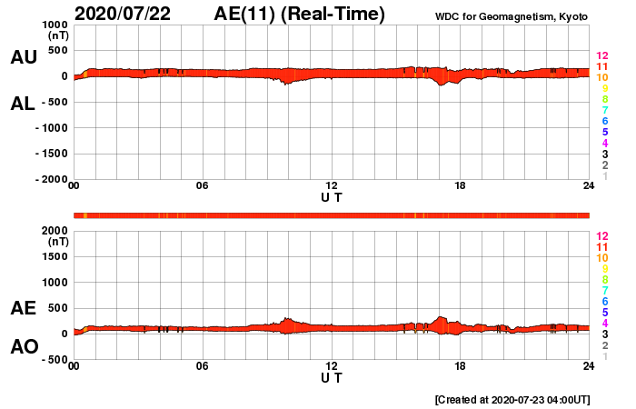 磁気圏は穏やかで、AE指数はほとんど変化のない状態です。