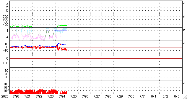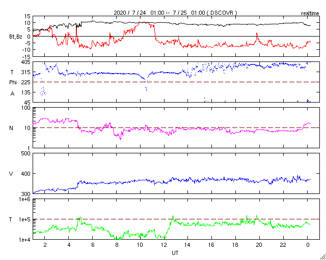2020/ 7/24 10:40 低速の太陽風が続いています。磁気圏も穏やかです。