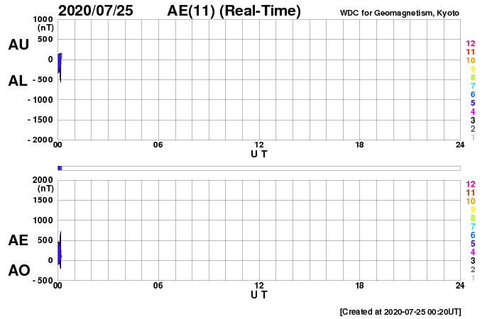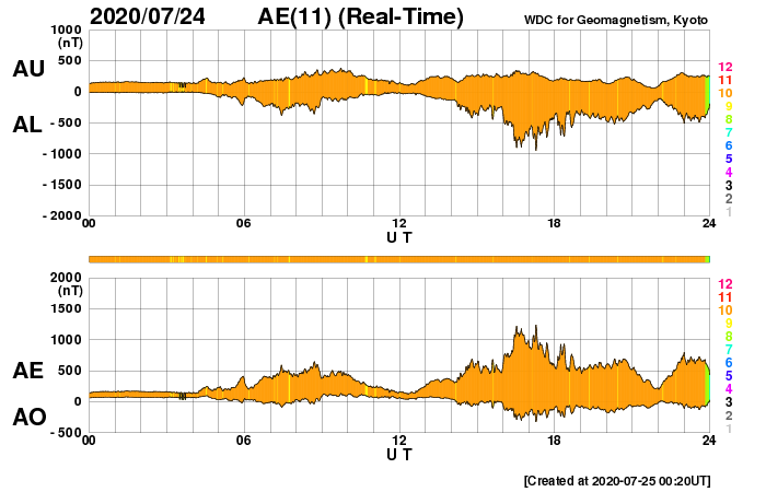 下段のAEグラフの値が高くなると、オーロラ活動が活発化しています。