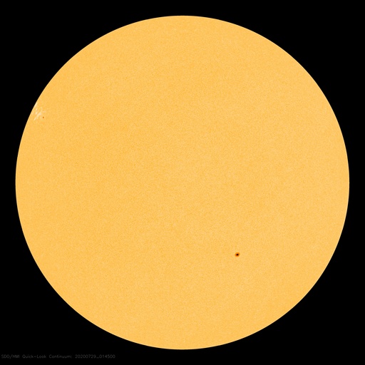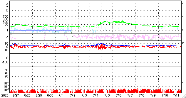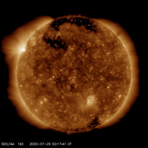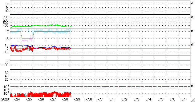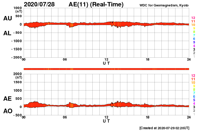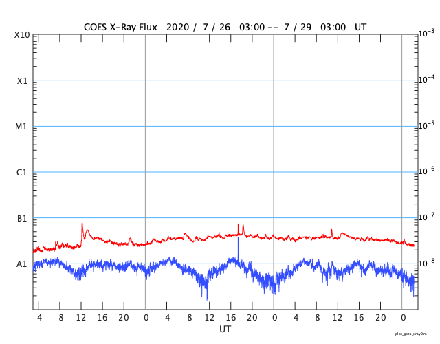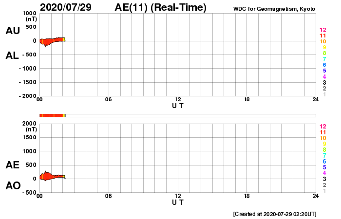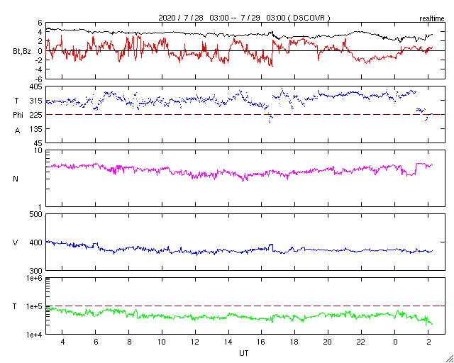 2020/ 7/29 11:29 更新 太陽風はやや低速になっています。磁気圏は穏やかです。 担当 篠原 太陽の北東に現れた黒点は、 2768群と番号が付けられています。 南西の2767群より小さい黒点が1つ見えるだけです。 X線グラフも変化はなく、太陽は穏やかです。 太陽風の速度は、400km/秒から370km/秒へ下がり、 やや低速になっています。 磁場強度も、3nTへ下がってやや弱くなっています。 磁場の南北成分は、小さく南北に変化しています。 AE指数では、小規模の変化が時々発生していますが、 全体としては穏やかです。 SDO衛星AIA193では、 北極から下へ伸びているコロナホールが見えています。 高めの緯度で止まっているので、 地球への影響は小さくなりそうです。