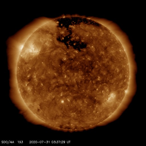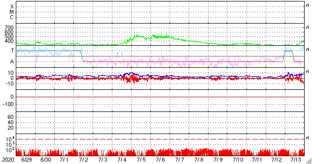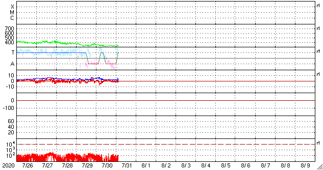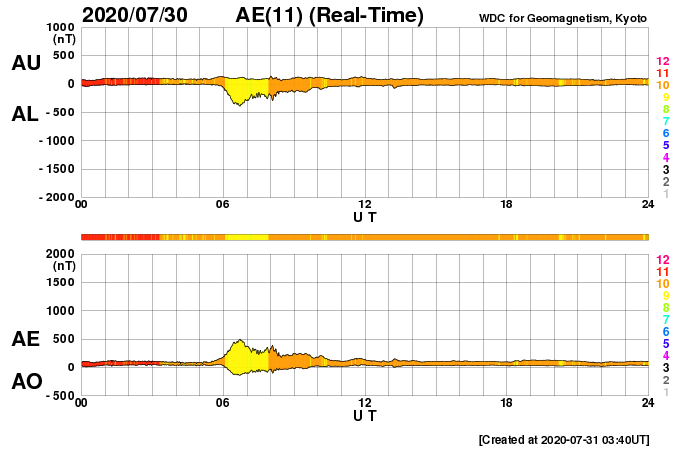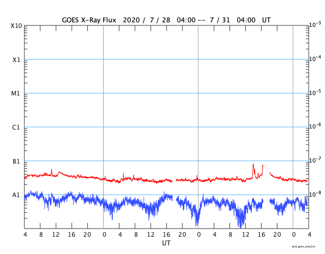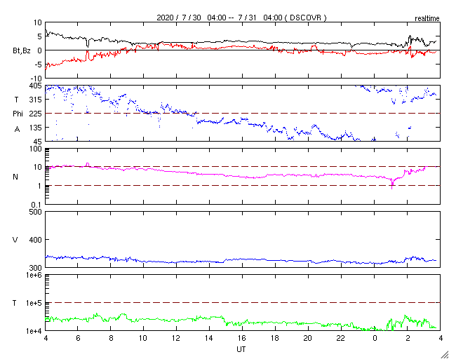 2020/ 7/31 12:53 更新 太陽風は低速で、磁気圏も穏やかです。新しい黒点が現れるかもしれません。 担当 篠原 太陽風の速度は、330km/秒前後で推移しています。 低速の風が続いています。 磁場強度は、2〜3nTと弱くなっています。 磁場の南北成分は、 グラフの最初に南向きの変化が見られますが、 以降は、0nT前後の小さい変化になっています。 速度が下がっていることもあり、磁気圏は穏やかで、 AE指数は磁場が南向きになった頃に500nTの変化がありますが、 その他は静かな状態です。 SDO衛星AIA193の太陽コロナ写真では、 北極から伸びるコロナホールが良く見えています。 2〜3日後くらいに太陽風の変化が到来するかもしれません。 27日周期の図を見ると 前周期の7月5日に太陽風速度の高まりが到来しています。 この変化の回帰になるのかもしれません。 太陽には、2767、2768の2つの黒点群が見えています。 X線グラフはAクラスの小さい変化がある程度で、 太陽は穏やかです。 SDO衛星AIA193を見ると、 北東の端(左上)に明るい部分が見えています。 2768群の向こう側から、 新しい活動領域が近づいている様です。 新しい黒点の出現になるでしょうか。