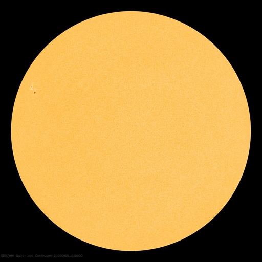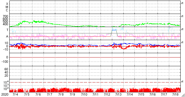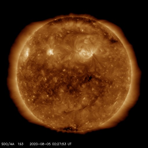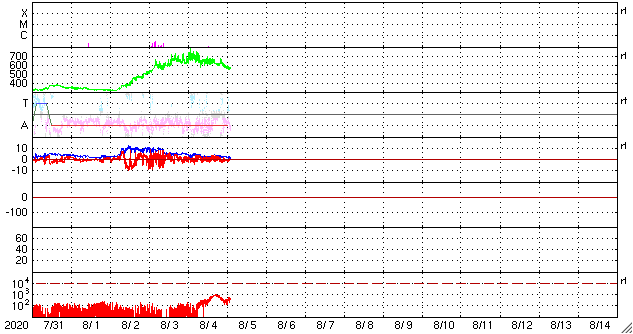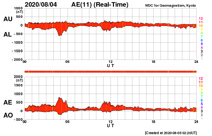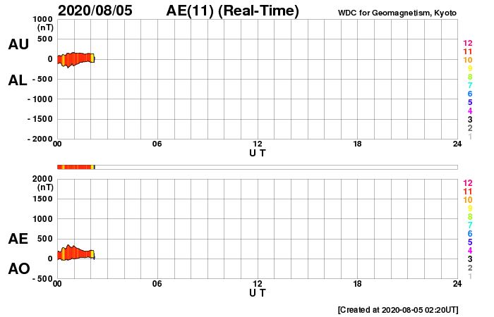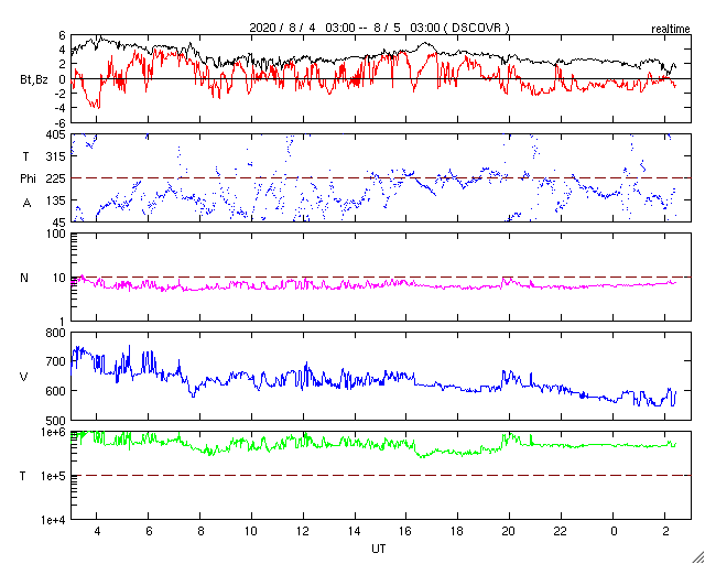 2020/ 8/ 5 11:39 更新 高速の太陽風が続いていますが、速度は下がり始めています。 担当 篠原 太陽風の速度は、昨日のニュースの頃が最高速度だった様で、 以降は次第に下がり、現在は570km/秒程度となっています。 高速の風は続いていますが、 速度の高まりは少し落ち着いています。 太陽風の磁場強度は、2〜3nTと弱くなっています。 南北成分の変化も小さくなり、 磁場の南向きは弱い変化しか起きていません。 このため、磁気圏の活動は穏やかになり、 AE指数のグラフの後半は、小さい変化に留まっています。 太陽風の速度はこの後も次第に低下して、 平均的な速さに戻っていきそうです。 太陽は、東端近くに2770黒点群が見えています。 大きさに特に変化はありません。 X線グラフも目立った変化はなく、太陽は穏やかです。