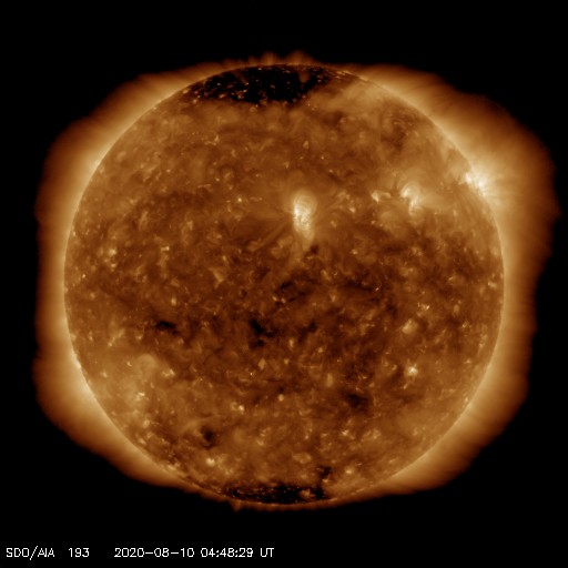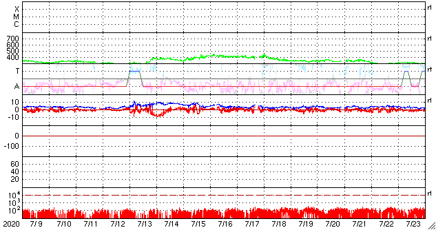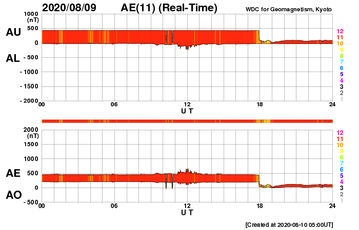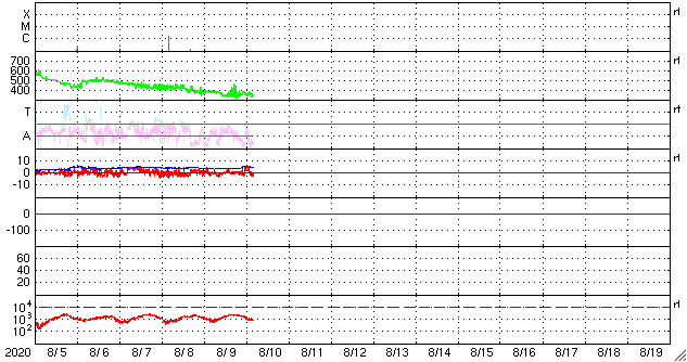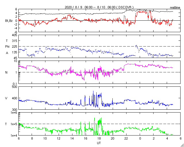 2020/ 8/10 14:04 更新 太陽風は低速になっています。磁気圏も穏やかです。 担当 篠原 太陽風は、350km/秒前後の低速の風になっています。 磁場強度は3nTから5nTへ少し上がり、平均的な状態です。 磁気圏は穏やかで、AE指数はほとんど変化が見られません。 SDO衛星AIA193の太陽コロナ写真は、 中央部に淡いコロナホールが見える程度で、 この後も穏やかな太陽風が続きそうです。 太陽は、2770黒点群が見えているだけです。 X線グラフも変化はなく、太陽は穏やかです。 STEREO Ahead衛星によると、 太陽の東端の向こう側の南半球側に活動的な領域がある様です。 どの様な領域が現れるでしょうか。