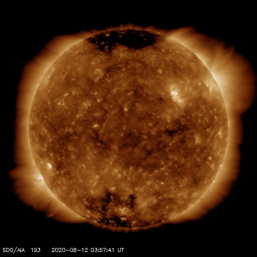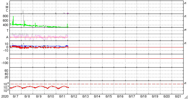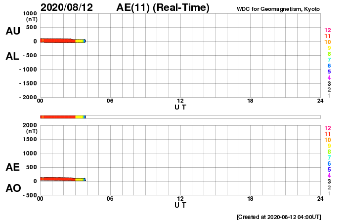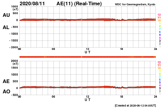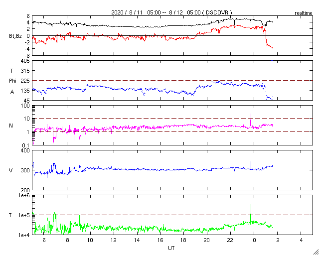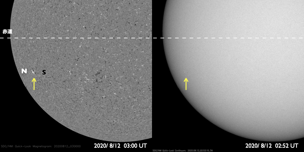 2020/ 8/12 13:09 更新 太陽に新しい黒点が現れています。太陽風は低速です。 担当 篠原 太陽の南東(左下)に新しい黒点が出現しています。 STEREO Ahead衛星で注目していた領域ではなく、 今朝早くから見え始めた黒点です。 緯度は南緯19度程度と高めで、 やや分かりにくいですが、 磁場の並びも新しい第25期の順番になっている様です。 昨日注目していた領域は、 ちょうど南東の端に見え始めたところです。 磁場写真に磁場の強まりが少し見えています。 2770黒点群は、黒点としては昨日よりも小さくなっていますが、 昨日のB2.3以降も、B2.6などのBクラスの小さいフレアを 繰り返し発生させています。 この後も活動は続くでしょうか。 太陽風は300km/秒前後の低速の風が続いています。 磁場強度も3〜4nTとやや弱い状態が続いていましたが、 グラフの後半で5nTに少し高まり、 磁場の南北成分が北向きから南向きに切り替わっています。 変化の規模としては小さいですが、 磁場が南向きに振れているので、 磁気圏の活動がやや高まるかもしれません。 ここまでの磁気圏は静穏で、AE指数はほとんど変化がありません。 ![]() 太陽の南東に現れた新しい黒点。SDO衛星の磁場と可視光写真。 (c) SDO (NASA)、作図:宇宙天気ニュース ![]() SDO衛星のAIA193カメラによる太陽コロナの様子 (c) SDO (NASA) ![]() SDO衛星による太陽の可視光写真。マウスの矢印を写真に重ねると、黒点番号付きの写真に切り替わります。 (c) SDO (NASA) ![]() GOES衛星の太陽X線強度。赤・橙 = 0.1〜0.8 nm、青・紫 = 0.05〜0.4 nm (c) データ:NOAA/SWPC、作図:宇宙天気ニュース ![]() DSCOVRが観測した太陽風の磁場(1番上の枠、黒線は全体の強度、赤線は南北成分) および、太陽風の密度(3番目の紫線)、速度(4番目の青線) (c) データ:NOAA/SWPC、作図:宇宙天気ニュース ![]() AE指数(速報値) 下段のAEグラフの値が高くなると、オーロラ活動が活発化しています。 (c) 京都大学WDC ![]() ![]() 27日の太陽周期に合わせたデータプロット 太陽が同じ面を地球に向けていた27日前の変化から、今後を予想することができます。 (c) 作図:宇宙天気ニュース