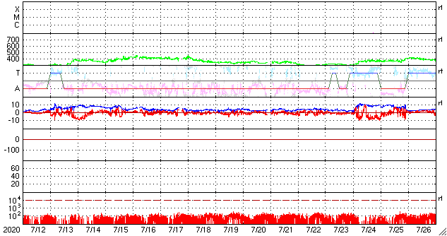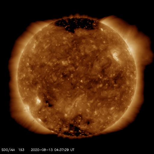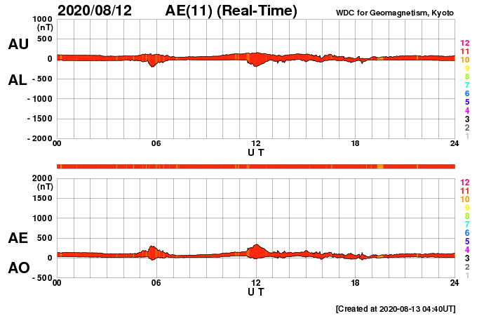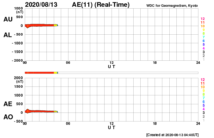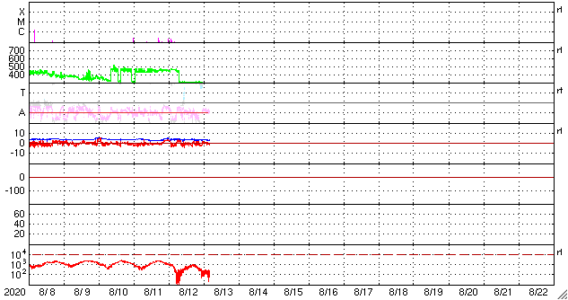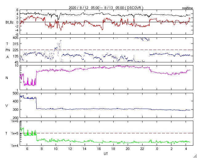 2020/ 8/13 13:48 更新 太陽風は低速で、磁気圏も穏やかです。昨日の黒点は2771群となっています。 担当 篠原 太陽風は、300km/秒の低速の風が続いています。 太陽風の速度のグラフの最初に、 450km/秒から300km/秒へ 急に速度が下がる変化が見えていますが、 最初の450km/秒の部分はデータエラーで、 ずっと300km/秒付近で安定している様です。 太陽風の磁場強度は、3nTとやや弱い状態です。 磁気圏は穏やかで、 AE指数は小さい変化が時々起きている程度です。 SDO衛星AIA193では、低緯度域にコロナホールは見られず、 この後も穏やかな太陽風が続きそうです。 太陽は、昨日南東(左下)に現れた黒点に 2771群と番号が付けられています。 一方、北西(右上)の2770黒点群は、 ほとんど見えなくなっています。 また、南西の端の向こう側から上がってきた領域は、 白斑は見えていますが、黒点はなかった様です。 X線グラフは、2770群で起きていた小さい活動がなくなり、 静かになっています。