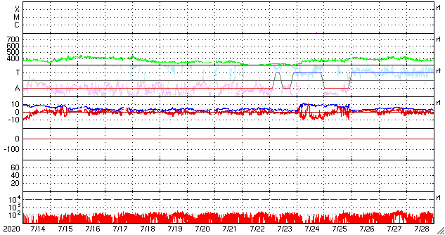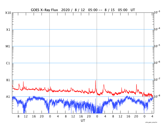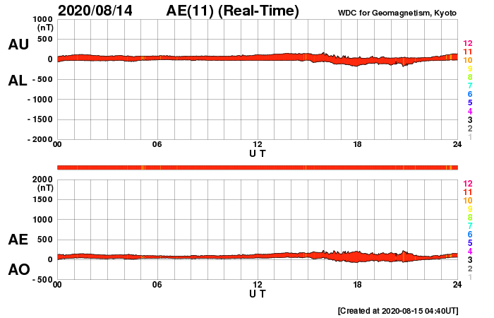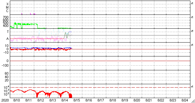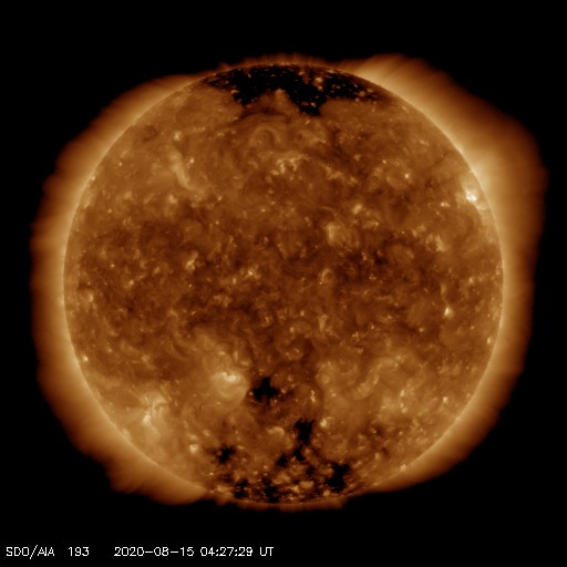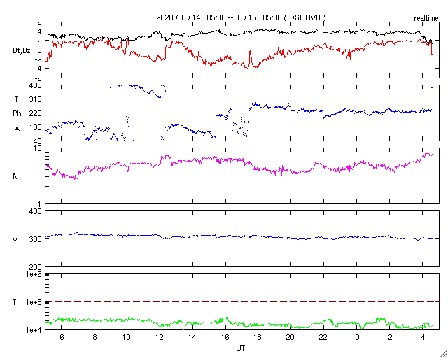 2020/ 8/15 13:44 更新 太陽は7月21日以来の無黒点です。低速の太陽風が続いています。 担当 篠原 太陽は、2770、2771黒点群の黒点が消えて、 無黒点になっています。 太陽が無黒点になるのは、7月21日以来で、 およそ24日連続で太陽に黒点が見えていたことになります。 黒点のある日がこれだけ連続するのは、 2017年10月以来で、およそ3年ぶりとなる様です。 黒点の発生が連続するのは、偶然という面もありますが、 太陽の活動が変わりつつあることを示している様に思います。 太陽風は、300km/秒の低速の風が安定して続いています。 磁場強度は3〜4nTです。 磁気圏は静穏で、AE指数はほとんど変化がありません。 SDO衛星AIA193は、 南極から低緯度側に伸びるコロナホールが、 太陽の中央線に達しています。 緯度が高めですが、太陽風に変化が見られるでしょうか。