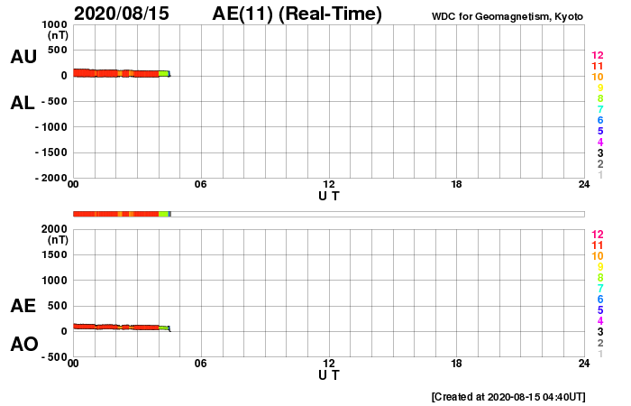 (c) SDO (NASA) ![]() SDO衛星による太陽の可視光写真 (c) SDO (NASA) ![]() GOES衛星の太陽X線強度。赤・橙 = 0.1〜0.8 nm、青・紫 = 0.05〜0.4 nm (c) データ:NOAA/SWPC、作図:宇宙天気ニュース ![]() DSCOVRが観測した太陽風の磁場(1番上の枠、黒線は全体の強度、赤線は南北成分) および、太陽風の密度(3番目の紫線)、速度(4番目の青線) (c) データ:NOAA/SWPC、作図:宇宙天気ニュース ![]() AE指数(速報値) 下段のAEグラフの値が高くなると、オーロラ活動が活発化しています。 (c) 京都大学WDC ![]() ![]() 27日の太陽周期に合わせたデータプロット 太陽が同じ面を地球に向けていた27日前の変化から、今後を予想することができます。 (c) 作図:宇宙天気ニュース