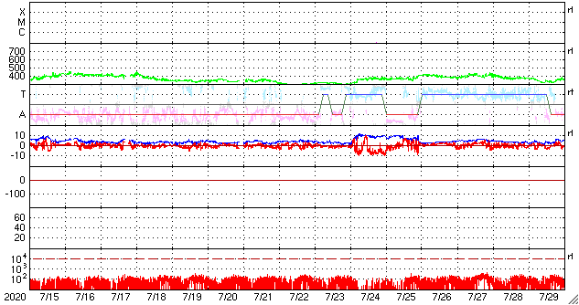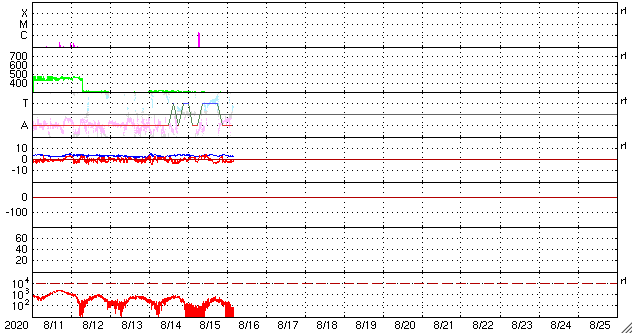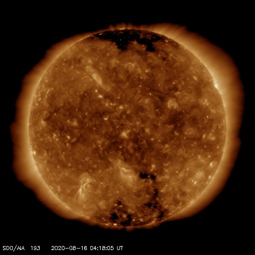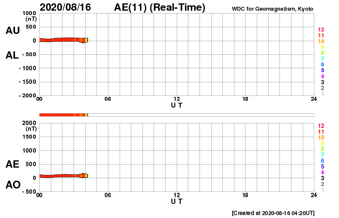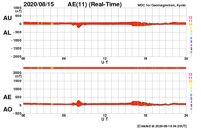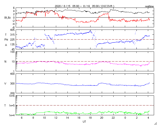 2020/ 8/16 13:26 更新 低速の太陽風が続き、磁気圏も静穏です。C2.0の小規模フレアが発生しました。 担当 篠原 太陽風は、280〜300km/秒の間を推移しています。 低速の状態が続いています。 磁場強度は、2〜4nTとやや弱い状態です。 磁気圏は静穏で、 AE指数は時々小さい変化が起きる程度です。 SDO衛星AIA193は、 南半球のコロナホールが西側に進んでいます。 低緯度域にはコロナホールはなく、 太陽風は基本的には穏やかな状態が続きそうです。 太陽は、今日も無黒点です。 昨日、15日15時半(世界時15日6時半)に、 太陽の北西(右上)の2770黒点群のあった領域で、 C2.0の小規模フレアが発生しました。 その後は特に活動はなく、 2770群の領域は西の端に沈もうとしています。 ![]() SDO衛星のAIA193カメラによる太陽コロナの様子 (c) SDO (NASA) ![]() SDO衛星による太陽の可視光写真 (c) SDO (NASA) ![]() DSCOVRが観測した太陽風の磁場(1番上の枠、黒線は全体の強度、赤線は南北成分) および、太陽風の密度(3番目の紫線)、速度(4番目の青線) (c) データ:NOAA/SWPC、作図:宇宙天気ニュース ![]() AE指数(速報値) 下段のAEグラフの値が高くなると、オーロラ活動が活発化しています。 (c) 京都大学WDC ![]() ![]() 27日の太陽周期に合わせたデータプロット 太陽が同じ面を地球に向けていた27日前の変化から、今後を予想することができます。 (c) 作図:宇宙天気ニュース