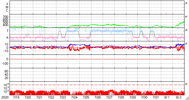 (c) SDO (NASA) ![]() SDO衛星による太陽の可視光写真。マウスの矢印を写真に重ねると、黒点番号付きの写真に切り替わります。 (c) SDO (NASA) ![]() GOES衛星の太陽X線強度。赤・橙 = 0.1〜0.8 nm、青・紫 = 0.05〜0.4 nm (c) データ:NOAA/SWPC、作図:宇宙天気ニュース ![]() DSCOVRが観測した太陽風の磁場(1番上の枠、黒線は全体の強度、赤線は南北成分) および、太陽風の密度(3番目の紫線)、速度(4番目の青線) (c) データ:NOAA/SWPC、作図:宇宙天気ニュース ![]() AE指数(速報値) 下段のAEグラフの値が高くなると、オーロラ活動が活発化しています。 (c) 京都大学WDC ![]() ![]() 27日の太陽周期に合わせたデータプロット 太陽が同じ面を地球に向けていた27日前の変化から、今後を予想することができます。 (c) 作図:宇宙天気ニュース