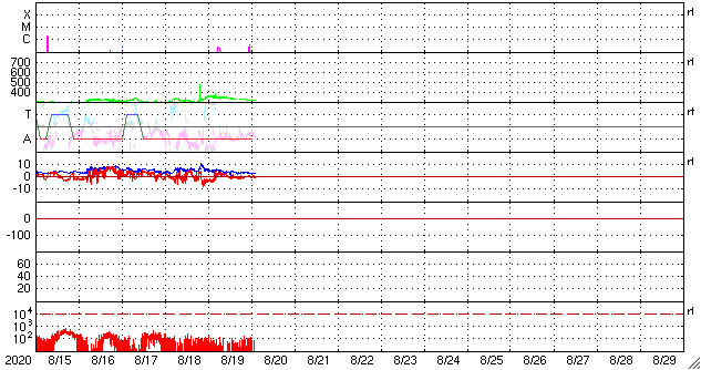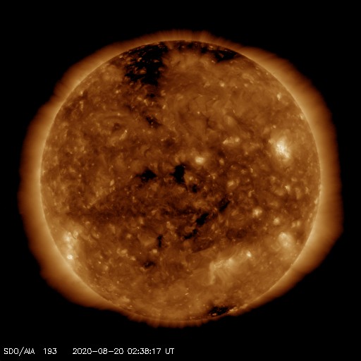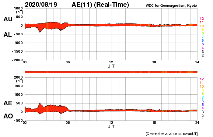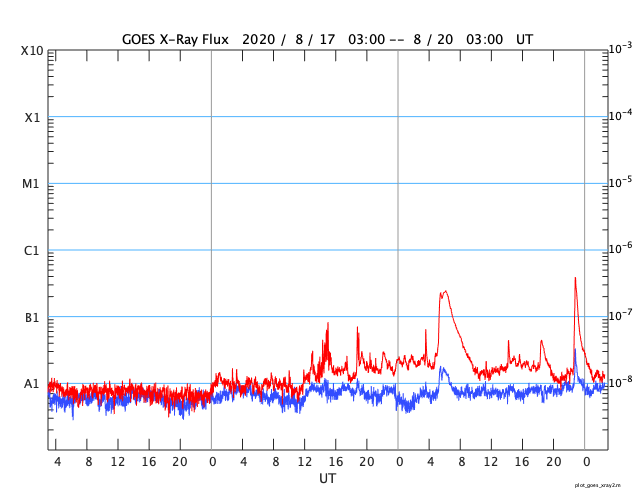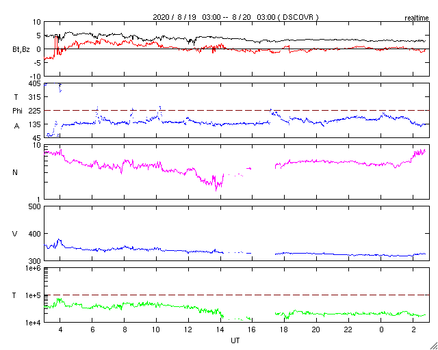 2020/ 8/20 11:52 更新 Bクラスの小さいフレアが発生しています。太陽風は低速です。 担当 篠原 太陽の北西(右上)の2772黒点群で、 昨日、19日15時(世界時19日6時)にB2.4、 今朝、20日8時(世界時19日23時)にB3.9の 小さいフレアが発生しています。 2772群は、黒点の見え方としては 次第に小さくなっている様で、 フレアの活動も弱くなって行くかもしれません。 昨日の太陽の中央部に見えていた小さい黒点は、 その後消えています。 また、SDO衛星AIA193の太陽の南東(左下)の端近くに 明るい領域が見えていますが、 ここに小さい黒点が見えているかもしれません。 (端に近いためはっきりしません) 太陽風は、昨日のニュース以降、速度は低下に向かい、 現在は320km/秒となっています。 低速の風が続いています。 太陽風の磁場強度も、5nTから3nTへ下がっています。 南北成分は0nT付近と小さくなり、 磁気圏は穏やかになっています。 AE指数は変化が見られなくなっています。 SDO衛星AIA193では、 太陽の中央部の淡いコロナホールは、 西側に通り過ぎようとしています。 この後、この領域の影響がやって来るでしょうか。 17日に発生したCMEの乱れも そろそろやって来るかもしれません。