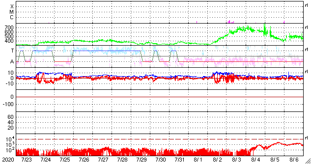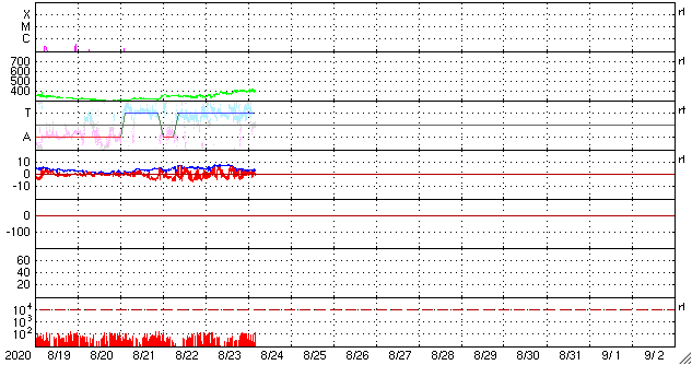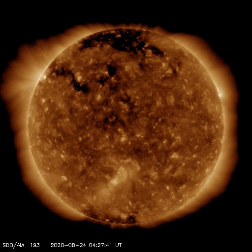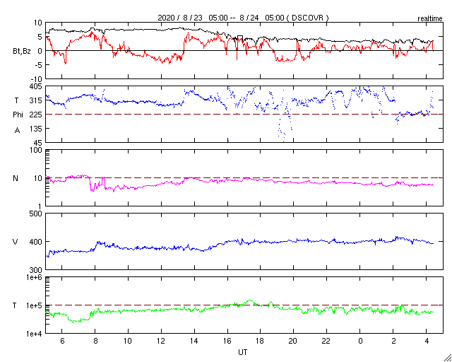 2020/ 8/24 13:31 更新 太陽風は平均的な速度に戻っています。太陽は無黒点です。 担当 篠原 太陽風の速度は、昨日の午後から少しずつ高まり、 今日に入る頃に400km/秒と平均的な速さに達しました。 現在までこの状態で安定しています。 磁場強度は、速度が高まる頃に7nTへ少し強まりましたが、 現在は3nTとやや弱い状態に下がっています。 磁場の南北成分は、小幅ですが南北に変化して、 AE指数には300〜500nTの小規模の変化が発生しています。 現在は磁場強度が弱まってきたので、 今後は、より穏やかな状態になりそうです。 SDO衛星AIA193では、 太陽の北東側(左上)に横に細長くコロナホールが伸びてます。 この領域は、27日周期の図の前周期の8月2日以降に 高速の太陽風をもたらしたと考えられます。 今回の回帰は8月29日頃に相当しますが、 太陽風はどの様な変化になるでしょうか。 太陽は無黒点が続いています。 X線グラフも変化はなく、太陽は穏やかです。