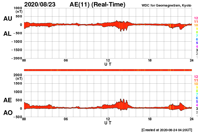 (c) SDO (NASA) ![]() SDO衛星による太陽の可視光写真 (c) SDO (NASA) ![]() DSCOVRが観測した太陽風の磁場(1番上の枠、黒線は全体の強度、赤線は南北成分) および、太陽風の密度(3番目の紫線)、速度(4番目の青線) (c) データ:NOAA/SWPC、作図:宇宙天気ニュース ![]() AE指数(速報値) 下段のAEグラフの値が高くなると、オーロラ活動が活発化しています。 (c) 京都大学WDC ![]() ![]() 27日の太陽周期に合わせたデータプロット 太陽が同じ面を地球に向けていた27日前の変化から、今後を予想することができます。 (c) 作図:宇宙天気ニュース
