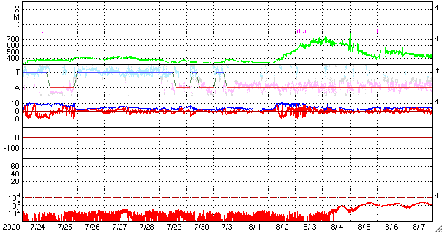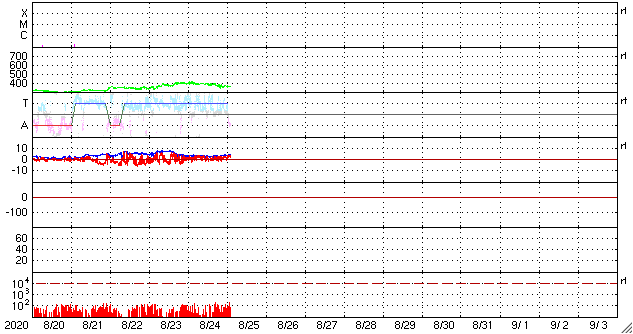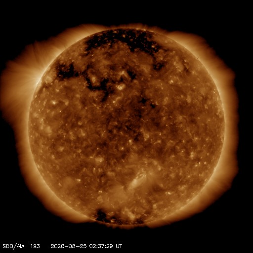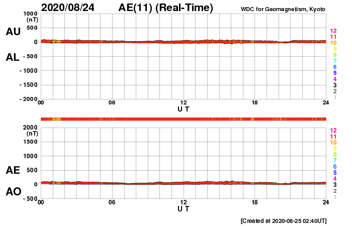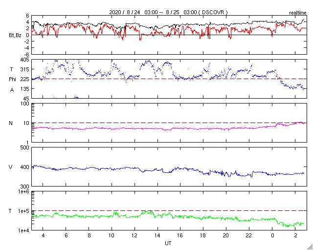 2020/ 8/25 11:52 更新 太陽風は低速になっています。磁気圏も穏やかです。 担当 篠原 太陽風は、速度が400km/秒から360km/秒へ下がり、 低速の風に戻っています。 磁場強度は、3〜4nTとやや弱い状態です。 磁場の南北成分は、 昨日のニュース以降、弱い北寄りになっています。 このため磁気圏は穏やかになっていて、 AE指数はほとんど変化がありません。 SDO衛星AIA193では、 北半球のコロナホールが、太陽の中心線付近まで進んでいます。 3〜4日後に太陽風速度の高まりが始まるかもしれません。 27日周期の図では, 前周期は8月2日から変化が始まっています。 太陽は無黒点です。 X線グラフも変化はなく、穏やかです。