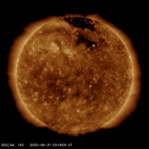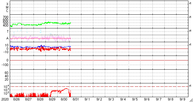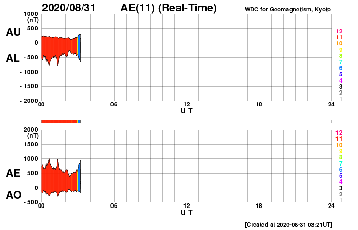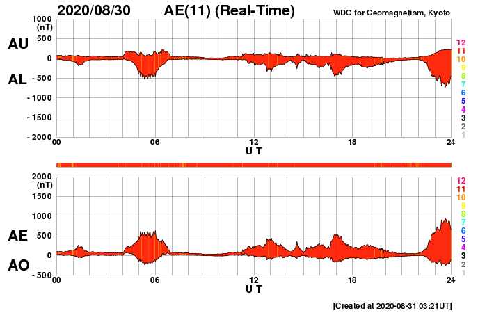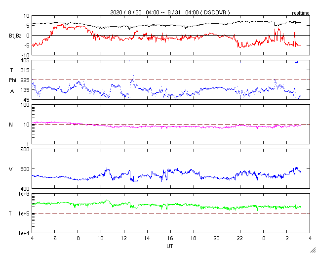 2020/ 8/31 12:25 更新 やや高速の太陽風が続き、磁気圏の活動も高まった状態です。 担当 篠原 太陽風は、450〜500km/秒とやや高速の状態で推移しています。 磁場強度も、5nTから7nTへ少し強まっています。 27日周期の図で前周期の高速風と比較すると、 勢いはだいぶ弱くなっています。 磁場の南北成分は、弱い南寄りの傾向から、 グラフの後半で南向きにやや強まっています。 このため、AE指数の変化も、 グラフの中盤までは500mT程度でしたが、 終わりのあたりでは、1000nTに達する変化になっています。 SDO衛星AIA193では、 北半球の緯度の高い領域のコロナホールが 太陽の西側に進んでいます。 この領域の影響が今後やって来る可能性があります。 高速太陽風は、もう一度強まるでしょうか。 太陽は無黒点です。 8月の後半は、黒点が現れないまま終わりそうです。 ![]() SDO衛星のAIA193カメラによる太陽コロナの様子 (c) SDO (NASA) ![]() SDO衛星による太陽の可視光写真 (c) SDO (NASA) ![]() DSCOVRが観測した太陽風の磁場(1番上の枠、黒線は全体の強度、赤線は南北成分) および、太陽風の密度(3番目の紫線)、速度(4番目の青線) (c) データ:NOAA/SWPC、作図:宇宙天気ニュース ![]() AE指数(速報値) 下段のAEグラフの値が高くなると、オーロラ活動が活発化しています。 (c) 京都大学WDC ![]() ![]() 27日の太陽周期に合わせたデータプロット 太陽が同じ面を地球に向けていた27日前の変化から、今後を予想することができます。 (c) 作図:宇宙天気ニュース