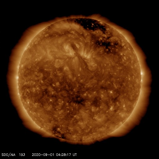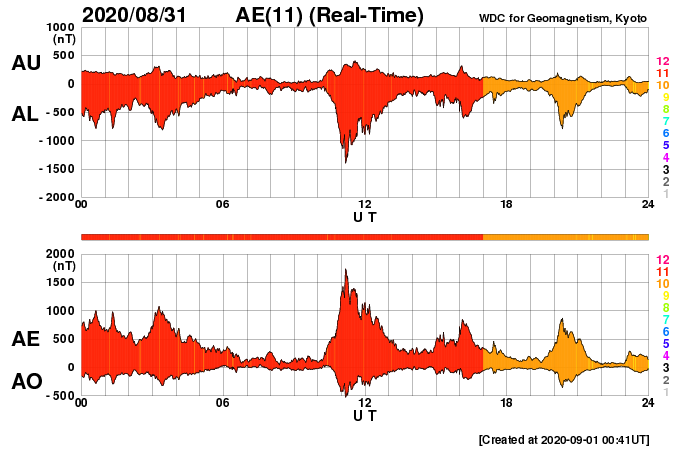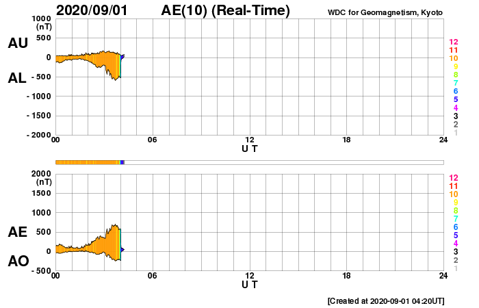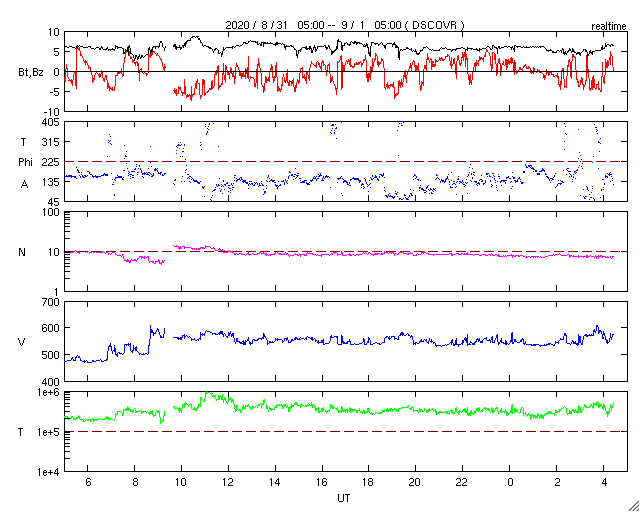 2020/ 9/ 1 13:40 更新 太陽風の速度が高まり、磁気圏の活動も強まっています。 担当 篠原 昨日の夕方に、太陽風の速度は560km/秒へ上昇し、 以降、この状態が続いています。 高速太陽風は再び高まっています。 磁場強度は、6nTと平均的な状態で安定しています。 磁場の南北成分は、 -5nT程度の南向きの変化が度々発生しています。 速度が高まったこともあり、 磁気圏の活動はより活発となって、 AE指数は、1700nTに達する激しい変化が発生し、 その後も700nTの中規模の活動が続いています。 SDO衛星AIA193を見ると、 北半球のコロナホールは西半球に進んでいて、 その後には目立つ領域はありません。 高速の太陽風は、 もう3日くらいで終わりを迎えるかもしれません。 太陽は無黒点です。 ![]() SDO衛星のAIA193カメラによる太陽コロナの様子 (c) SDO (NASA) ![]() SDO衛星による太陽の可視光写真 (c) SDO (NASA) ![]() DSCOVRが観測した太陽風の磁場(1番上の枠、黒線は全体の強度、赤線は南北成分) および、太陽風の密度(3番目の紫線)、速度(4番目の青線) (c) データ:NOAA/SWPC、作図:宇宙天気ニュース ![]() AE指数(速報値) 下段のAEグラフの値が高くなると、オーロラ活動が活発化しています。 (c) 京都大学WDC ![]() ![]() 27日の太陽周期に合わせたデータプロット 太陽が同じ面を地球に向けていた27日前の変化から、今後を予想することができます。 (c) 作図:宇宙天気ニュース