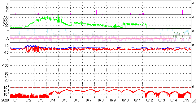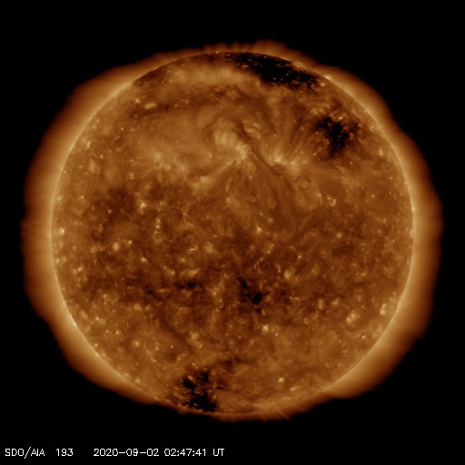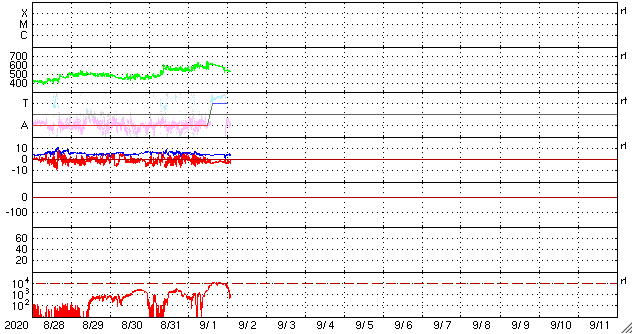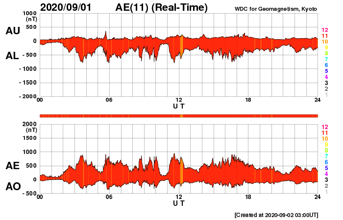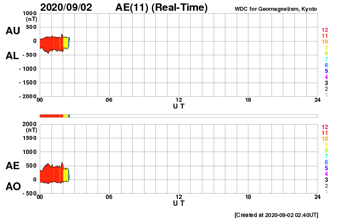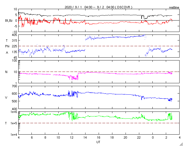 2020/ 9/ 2 12:03 更新 太陽風の速度は600km/秒台へ高まりました。現在は530km/秒です。 担当 篠原 太陽風の速度は、昨日の午後に620km/秒まで高まりました。 前周期に続いて600km/秒台到達です。 そして、今日に入った頃から速度は少しずつ低下して、 現在は530km/秒と、高速の状態は続いていますが、 昨日の高まりは一段落しています。 磁場強度は、6nTから4nTへ少し下がっています。 南北成分は弱い南寄りが続いています。 磁気圏の活動は高まった状態が続いていて、 AE指数のグラフは、 800nT前後の中規模の活動がグラフの中盤まで続いています。 しかし、グラフの後半になると、 変化は500nTくらいに少し下がっています。 太陽風の速度が下がってきた影響でしょうか。 SDO衛星AIA193では、 太陽の中央部はぼんやりと光っているだけで、 この後の太陽風は、穏やかな風になりそうです。 太陽は無黒点で穏やかです。 台風9号は、そろそろ鹿児島に最接近となりそうですが、 今のところ、風雨ともに特に強まっていません。 一方、週末には台風10号が鹿児島を直撃しそうな様子で、 こちらの影響が心配です。