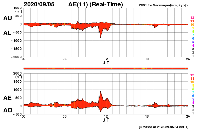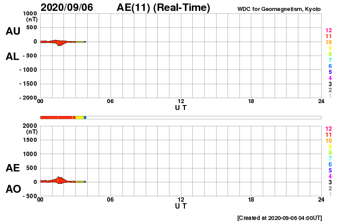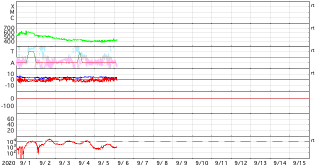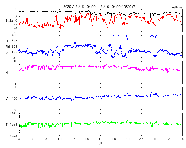 2020/ 9/ 6 12:59 更新 太陽風は平均的な速度で、磁気圏も穏やかです。 担当 篠原 太陽風の速度は、400km/秒から430km/秒へ少し上がっていますが、 平均的な状態が続いています。 磁場強度は、3〜4nTとやや弱くなっています。 磁場の南北成分は、 南寄りから北寄りに傾向が変わっている様で、 AE指数のグラフも、前半は500nT前後の変化が発生していますが、 後半は静かになっています。 SDO衛星AIA193にはコロナホールは見られず、 この後、太陽風は次第に低速になっていくのではないでしょうか。 太陽は無黒点で穏やかです。 台風10号が近付いて、風雨が次第に強まっています。 鹿児島は今夜がピークになりそうです。 予報では台風の移動が少し速くなった様で、 明日の昼には情報BOX等の情報更新を再開できそうです。 ![]() SDO衛星のAIA193カメラによる太陽コロナの様子 (c) SDO (NASA) ![]() SDO衛星による太陽の可視光写真 (c) SDO (NASA) ![]() DSCOVRが観測した太陽風の磁場(1番上の枠、黒線は全体の強度、赤線は南北成分) および、太陽風の密度(3番目の紫線)、速度(4番目の青線) (c) データ:NOAA/SWPC、作図:宇宙天気ニュース ![]() AE指数(速報値) 下段のAEグラフの値が高くなると、オーロラ活動が活発化しています。 (c) 京都大学WDC ![]() ![]() 27日の太陽周期に合わせたデータプロット 太陽が同じ面を地球に向けていた27日前の変化から、今後を予想することができます。 (c) 作図:宇宙天気ニュース