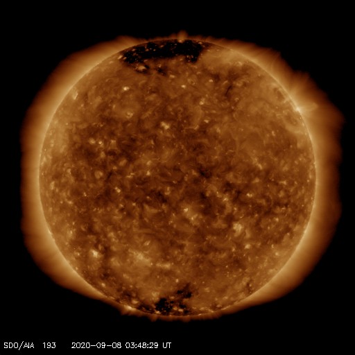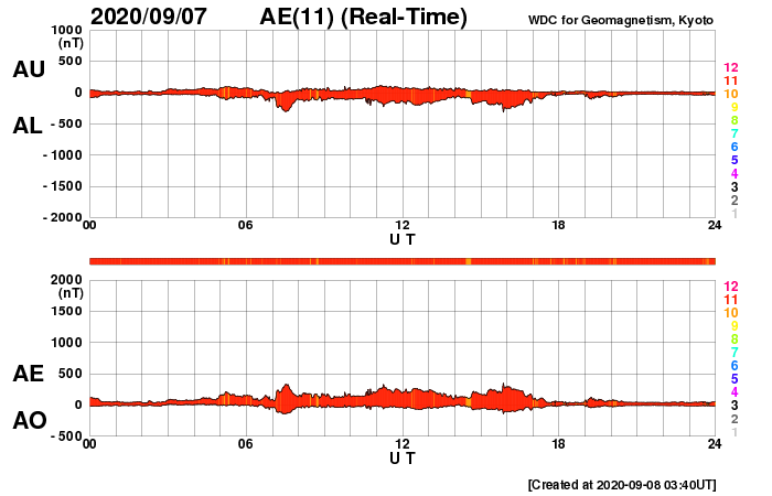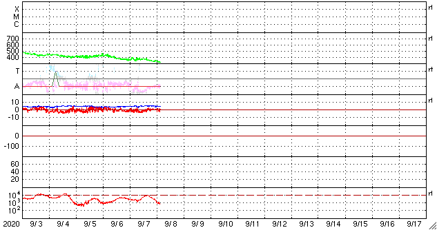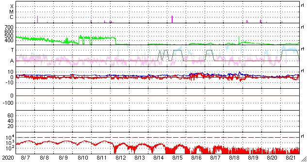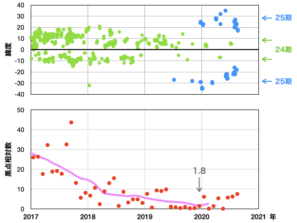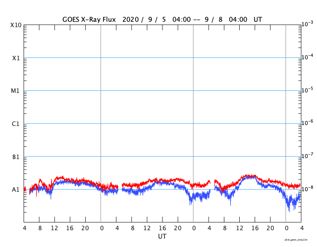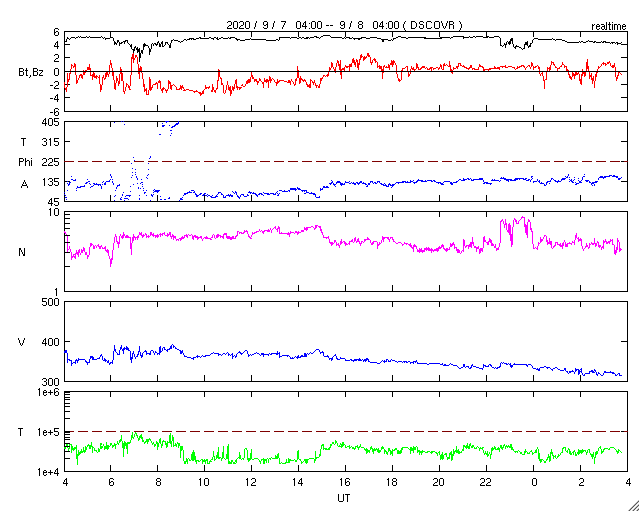 2020/ 9/ 8 12:54 更新 太陽風は更に低速になっています。8月の黒点相対数は 7.6 でした。 担当 篠原 台風の接近もありお知らせするのが遅れましたが、 8月の黒点相対数の月平均値は、 7.6 とWDC-SILSOより発表されています。 5月の 0.2 以降、6月の 5.8、7月の 6.3、そして8月の 7.6と、 小さい変化ですが、月平均値は上昇を続けています。 このため、13か月平均値も、 昨年12月の 1.8 を最低値として、その後は上昇が続いています。 1枚目の下のグラフで、変化を拡大して表示しています。 8月に見えた黒点群は、7月の続きで2767群、2768群、 そして、新しく2769群〜2772群の4群が発生しています。 出現緯度は、17〜27度の範囲で(南北両半球を含んでいます)、 新しい第25期の黒点群と考えられます。 第25期の始まりについては、 WDC-SILSOにも記事が掲載されています。 8月の無黒点の日は13日でした。 8月は、前半は黒点が見える日が続いていたのですが、 22日以降は現れなくなり、9月に入った現在まで続いています。 このままだと、9月の黒点相対数はまた下がってしまうかもしれず、 新しい周期の始まりは、引き続き注目する必要がある様です。 その太陽は、SDO衛星の可視光写真を拡大すると、 南東(左下)に小さい黒点ができている様に見えます。 (AIA193で少し明るくなっている場所です) 群番号が付けられる様な領域に発達するでしょうか。 X線グラフは特に変化はありません。 太陽風は、320km/秒へ速度が下がり、 更に低速の風になっています。 磁場強度は、4〜5nTと平均的な状態です。 磁場の南北成分は、グラフの前半は弱い南寄りですが、 後半は0nT付近になっています。 このため、AE指数も前半に250nTの小規模の変化が続いていますが、 以降は変化が見られなくなっています。 SDO衛星AIA193には、コロナホールは見られず、 この後も低速の太陽風が続きそうです。