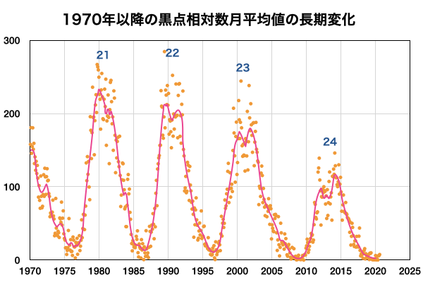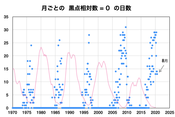 (c) 黒点データ:NOAA/SWPC、WDC-SILSO、作図:宇宙天気ニュース ![]() 太陽黒点相対数の長期変化。7月の黒点相対数は 7.6 でした。 (c) 黒点データ:WDC-SILSO、作図:宇宙天気ニュース ![]() 1970年以降の太陽黒点相対数の長期変化。 (c) 黒点データ:WDC-SILSO、作図:宇宙天気ニュース ![]() 1970年以降の月毎の無黒点日の日数。 (c) 黒点データ:WDC-SILSO、作図:宇宙天気ニュース ![]() SDO衛星のAIA193カメラによる太陽コロナの様子 (c) SDO (NASA) ![]() SDO衛星による太陽の可視光写真 (c) SDO (NASA) ![]() GOES衛星の太陽X線強度。赤・橙 = 0.1〜0.8 nm、青・紫 = 0.05〜0.4 nm (c) データ:NOAA/SWPC、作図:宇宙天気ニュース ![]() DSCOVRが観測した太陽風の磁場(1番上の枠、黒線は全体の強度、赤線は南北成分) および、太陽風の密度(3番目の紫線)、速度(4番目の青線) (c) データ:NOAA/SWPC、作図:宇宙天気ニュース ![]() AE指数(速報値) 下段のAEグラフの値が高くなると、オーロラ活動が活発化しています。 (c) 京都大学WDC ![]() ![]() 27日の太陽周期に合わせたデータプロット 太陽が同じ面を地球に向けていた27日前の変化から、今後を予想することができます。 (c) 作図:宇宙天気ニュース