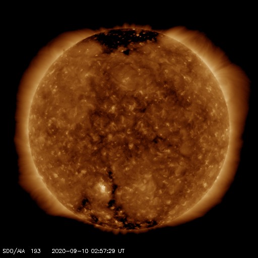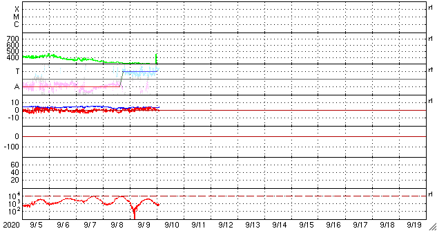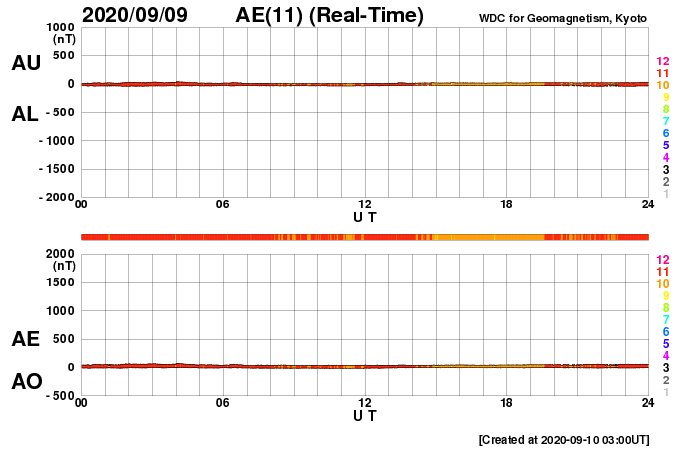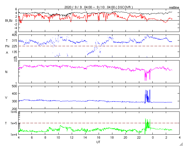 2020/ 9/10 12:11 更新 太陽風の速度は290km/秒へ下がっています。磁気圏はとても穏やかです。 担当 篠原 太陽風の速度は、小幅ですが300km/秒から290km/秒へ下がり、 更に低速になっています。 磁場強度は、3〜4nTとやや弱い状態で安定しています。 磁場の南北成分は、北寄りの傾向になっています。 磁気圏はとても穏やかで、 AE指数のグラフは、全く変化がありません。 SDO衛星AIA193は、 南極から縦に細くコロナホールが伸びている程度です。 穏やかな太陽風が続きそうです。 太陽は、無黒点が続いています。 SDO衛星AIA193は、 南半球に明るく光る小さい領域があるだけです。 無黒点はどこまで続くでしょうか。 ![]() SDO衛星のAIA193カメラによる太陽コロナの様子 (c) SDO (NASA) ![]() SDO衛星による太陽の可視光写真 (c) SDO (NASA) ![]() DSCOVRが観測した太陽風の磁場(1番上の枠、黒線は全体の強度、赤線は南北成分) および、太陽風の密度(3番目の紫線)、速度(4番目の青線) (c) データ:NOAA/SWPC、作図:宇宙天気ニュース ![]() AE指数(速報値) 下段のAEグラフの値が高くなると、オーロラ活動が活発化しています。 (c) 京都大学WDC ![]() ![]() 27日の太陽周期に合わせたデータプロット 太陽が同じ面を地球に向けていた27日前の変化から、今後を予想することができます。 (c) 作図:宇宙天気ニュース