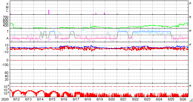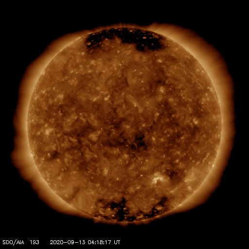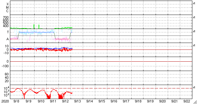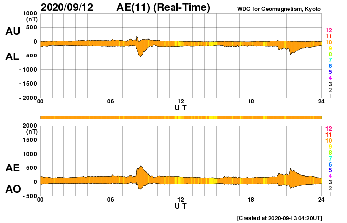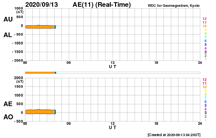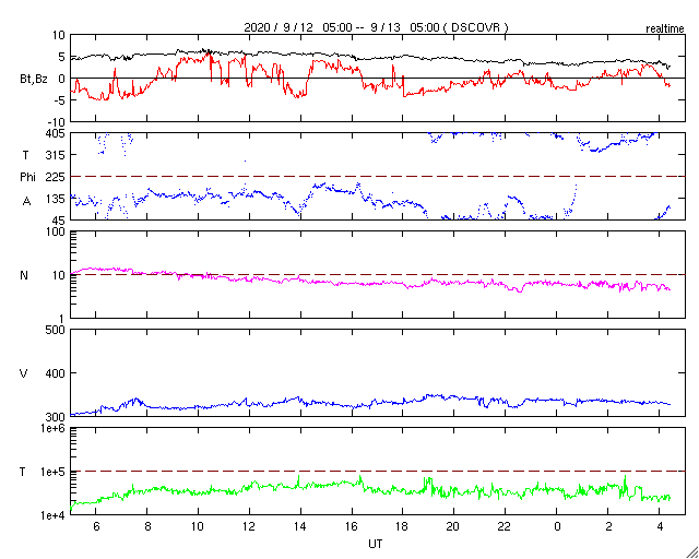 2020/ 9/13 13:31 更新 低速の太陽風が続いています。太陽に小さい黒点が現れている様です。 担当 篠原 太陽風は低速の風が続いています。 速度は、300km/秒から330km/秒へ少し上がっています。 磁場強度は、グラフの前半は5nT、後半は3nTです。 平均的か、やや弱い状態です。 磁場の南北成分は、ゆっくりと南北に変化していて、 南を向いた頃に、AE指数に小規模の変化が発生しています。 しかし、全体としては、磁気圏も穏やかに推移しています。 SDO衛星AIA193では、低緯度域にコロナホールはなく、 穏やかな太陽風が続きそうです。 SDO衛星AIA193の南西側(右下)に、 明るく光る点ができています。 可視光写真を拡大すると、 ここに小さい黒点ができている様です。 群番号が付けられる様な規模に発達するでしょうか。
