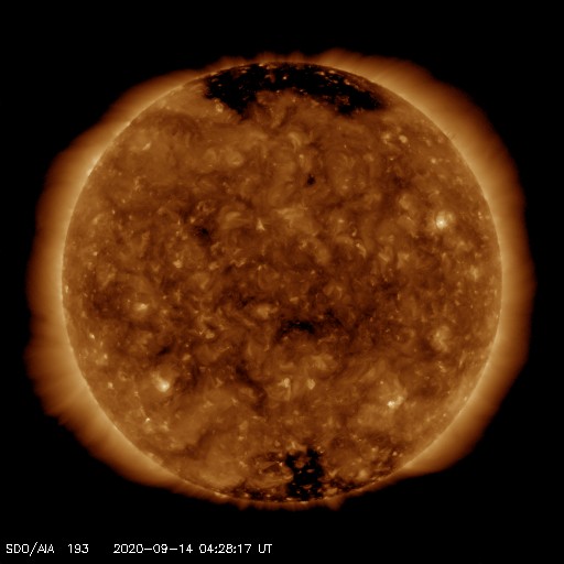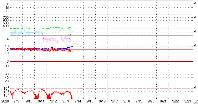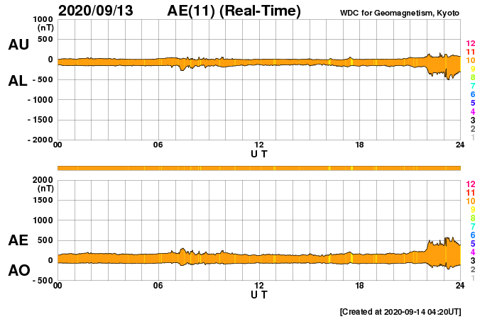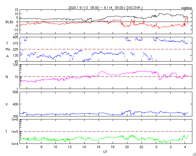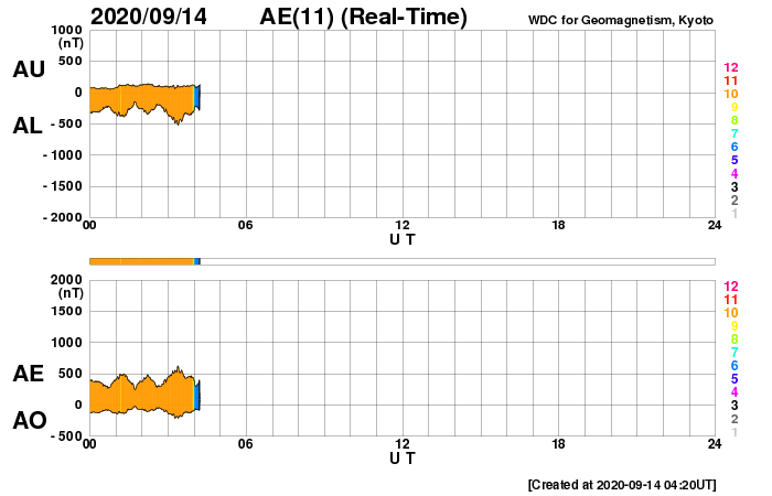 2020/ 9/14 13:31 更新 太陽風磁場が南に振れて、磁気圏の活動をやや高めています。ムルマンスクのオーロラをどうぞ。 担当 篠原 福島留美さんよりいただいた、 ロシア・ムルマンスクのオーロラ写真の続きを紹介します。 今日は、8月29〜31日に撮影された写真です。 この頃は、太陽風の速度が500km/秒前後と高まっていて、 オーロラの活動度を示すAE指数は、 1000nTに達する変化も度々発生していました。 オーロラとしても活発な変化が見えていたのではないでしょうか。 一昨日の2枚に続いて、今日の3枚も水面を含めた写真になっています。 秋ならではのオーロラの風景なのかもしれません。 きれいな写真をありがとうございます。 太陽風は、320〜330km/秒の低速の風が続いています。 磁場強度は、グラフの初めは4nTでしたが、 中ほどから高まり始め、後半では10nTまで変化しています。 それと供に、南北成分が南向きに振れるようになり、 -5nT前後の南向きが8時間ほど続いています。 しかし、AE指数は、500nTの変化が続く様になった程度で、 磁気圏の活動はやや高まった程度です。 太陽風の速度が遅くなっていることが影響している様です。 太陽風のグラフの最後では、 南北成分は北向きに切り替わっています。 この状態が続くと、磁気圏は再び静かになるでしょう。 太陽では、南西側(右下)の小さい黒点は消えてしまいましたが、 続いて、北西側(右上)に小さい黒点が発生しています。 SDO衛星AIA193で、明るく光っている地点です。 X線グラフには、Aクラスの小さいフレアが起きています。 これは、南西の小さい黒点があった場所で発生しています。