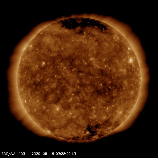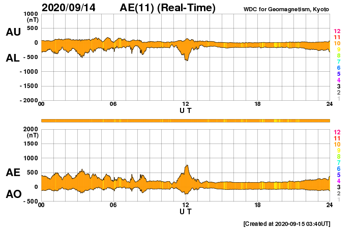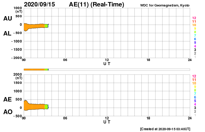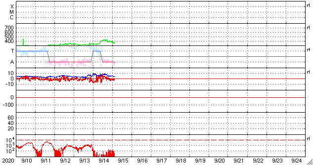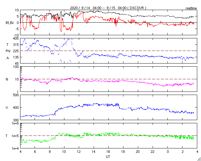2020/ 9/15 12:48 更新 太陽風の速度が少し高まりましたが、現在は低速に戻っています。 担当 篠原 太陽風の速度は、昨日の夕方に400km/秒へ上昇し、 420km/秒くらいまで高まった後、 今日の未明には下がり始めて、 現在は350km/秒と低速の風に戻っています。 全体としては小幅の変化です。 磁場強度も、速度が高まる頃に9nTへやや強まりましたが、 現在は4nTに戻っています。 磁気圏は穏やかな状態が続いていて、 AE指数は、速度が上昇した頃に 700nTの中規模の変化が起きていますが、 以降は特に変化なく、穏やかに推移しています。 太陽は、昨日、北西に見えていた小さい黒点は、 それ以上大きくなることはなく、 現在はほとんど見えなくなっています。 X線グラフも変化はなく、穏やかです。 ![]() SDO衛星のAIA193カメラによる太陽コロナの様子 (c) SDO (NASA) ![]() SDO衛星による太陽の可視光写真 (c) SDO (NASA) ![]() DSCOVRが観測した太陽風の磁場(1番上の枠、黒線は全体の強度、赤線は南北成分) および、太陽風の密度(3番目の紫線)、速度(4番目の青線) (c) データ:NOAA/SWPC、作図:宇宙天気ニュース ![]() AE指数(速報値) 下段のAEグラフの値が高くなると、オーロラ活動が活発化しています。 (c) 京都大学WDC ![]() ![]() 27日の太陽周期に合わせたデータプロット 太陽が同じ面を地球に向けていた27日前の変化から、今後を予想することができます。 (c) 作図:宇宙天気ニュース
