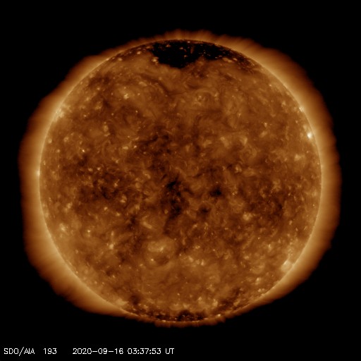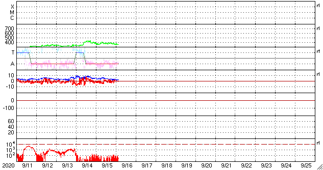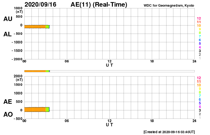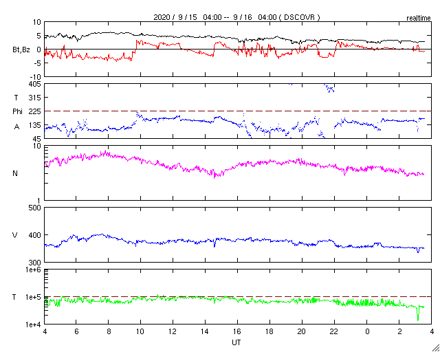 2020/ 9/16 12:45 更新 太陽風は低速の状態が続いています。磁気圏も穏やかです。 担当 篠原 太陽風は、350〜380km/秒と低速の風が続いています。 磁場強度は、グラフの前半は5nTでしたが、 次第に3nTへ下がり、やや弱くなっています。 磁気圏も概ね静穏で、 AE指数は、500nTの変化が2回ほど起きていますが、 その他は特に変化のない状態です。 SDO衛星AIA193は、 北極のコロナホールが大きく見えていますが、 低緯度域は小さいコロナホールが所々に見えている程度です。 この後も穏やかな太陽風が続きそうです。 太陽は今日も無黒点です。 X線グラフも変化はありません。 先月の前半は、黒点がある日が続いていたのですが、 後半からとても静かになっています。 ![]() SDO衛星のAIA193カメラによる太陽コロナの様子 (c) SDO (NASA) ![]() SDO衛星による太陽の可視光写真 (c) SDO (NASA) ![]() DSCOVRが観測した太陽風の磁場(1番上の枠、黒線は全体の強度、赤線は南北成分) および、太陽風の密度(3番目の紫線)、速度(4番目の青線) (c) データ:NOAA/SWPC、作図:宇宙天気ニュース ![]() AE指数(速報値) 下段のAEグラフの値が高くなると、オーロラ活動が活発化しています。 (c) 京都大学WDC ![]() ![]() 27日の太陽周期に合わせたデータプロット 太陽が同じ面を地球に向けていた27日前の変化から、今後を予想することができます。 (c) 作図:宇宙天気ニュース