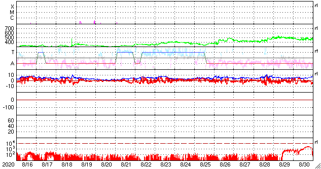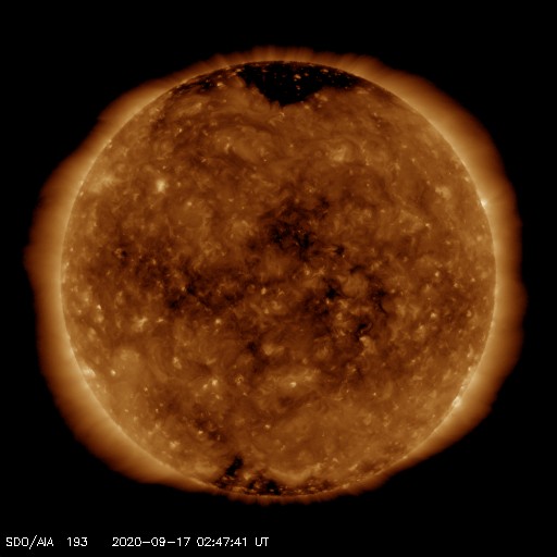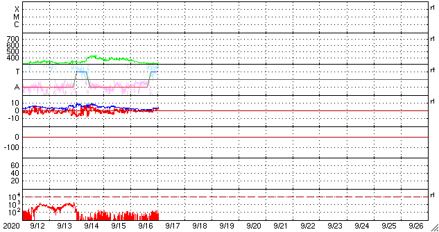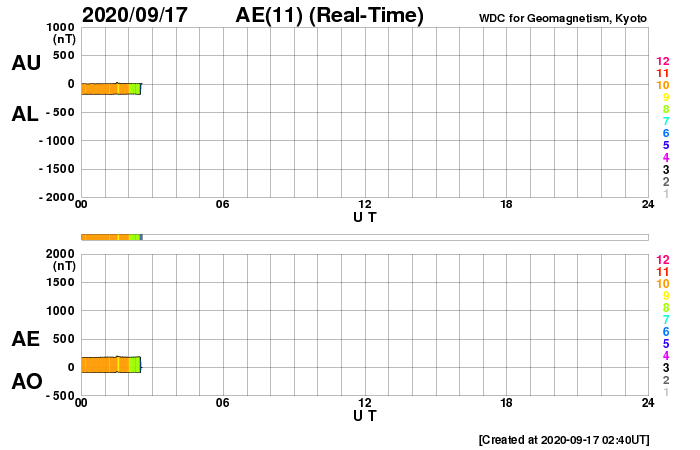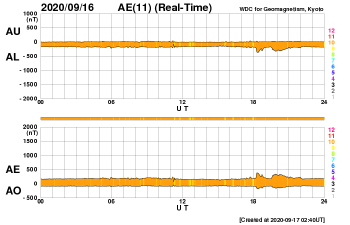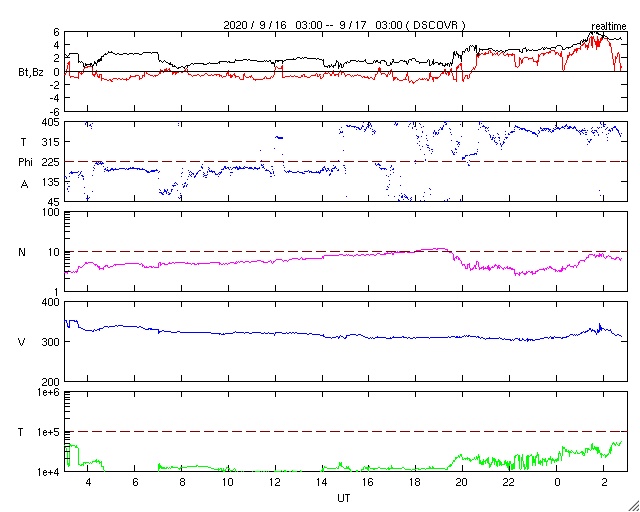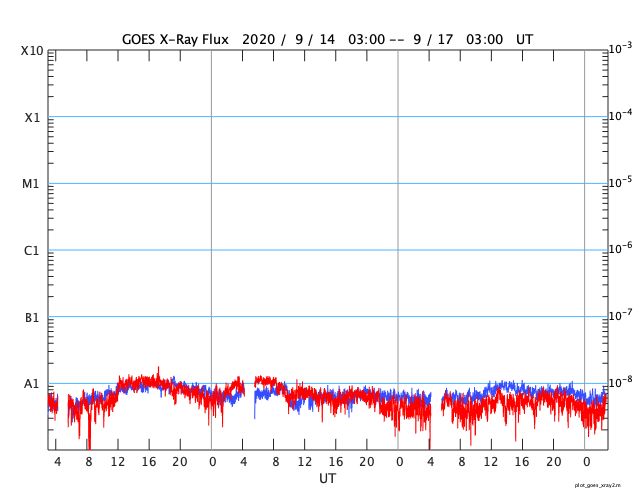 2020/ 9/17 12:00 更新 低速の太陽風が続いています。太陽は無黒点です。 担当 篠原 太陽風の速度は更に下がり、310〜320km/秒で推移しています。 磁場強度は、グラフの中盤までは1〜2nTと弱くなっていましたが、 グラフの最後は5nTと平均的な値に戻っています。 穏やかな太陽風が続いています。 磁気圏も静穏で、 AE指数は小規模の変化が一時的に発生しただけで、 その他の時間帯は静かに推移しています。 SDO衛星AIA193では、 低緯度域は、ぼんやりとしたコロナホールが見える程度です。 この後も穏やかな太陽風が続きそうです。 太陽は、今日も無黒点です。 X線グラフも変化はありません。 国立天文台 太陽観測科学プロジェクトより、 太陽の第25活動周期の始まりに関する記事が公開されています。 どうぞご覧下さい。