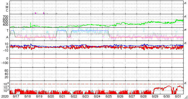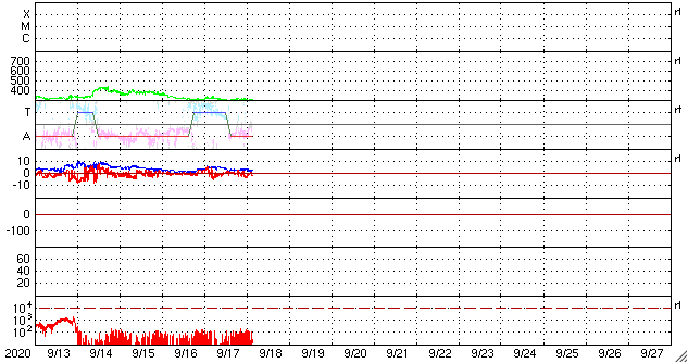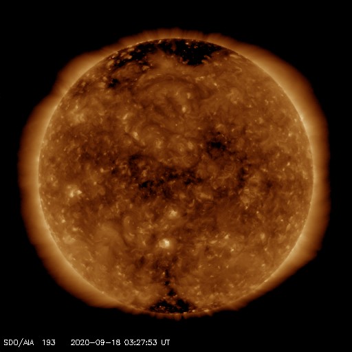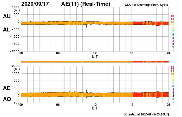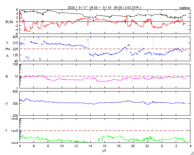 2020/ 9/18 12:38 更新 300km/秒の低速の太陽風が続いています。磁気圏も静穏です。 担当 篠原 太陽風は、300〜310km/秒の低速の風が続いています。 磁場強度は、3nT前後とやや弱くなっています。 磁気圏も静穏で、AE指数はほとんど変化のない状態です。 SDO衛星AIA193は、 北極と南極にコロナホールの暗い領域が広がっていますが、 低緯度域は、ところどころに淡いコロナホールが見えている程度です。 この後も穏やかな太陽風が続きそうです。 STEREO Ahead衛星の画像を見ると、 東端の向こう側では、 北半球の中〜低緯度域にコロナホールが広がっている様です。 次の太陽風の高まりは、この領域の影響になりそうです。 太陽は、無黒点です。 X線グラフも静かに推移しています。