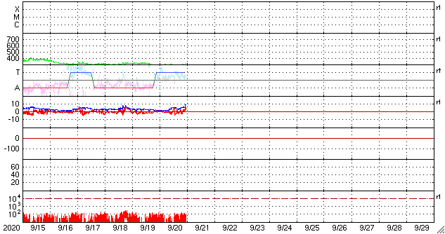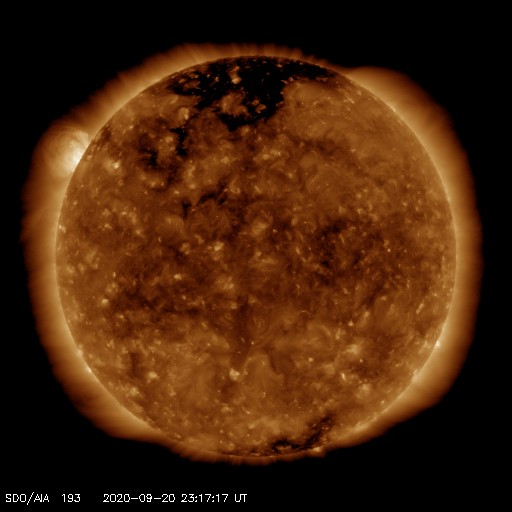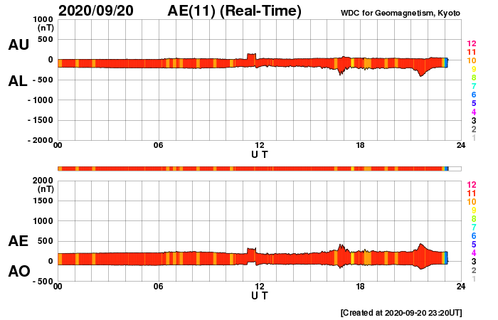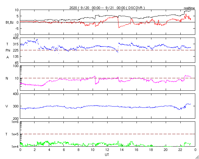 2020/ 9/21 08:35 更新 300km/秒の低速の太陽風が続いています。太陽の東端から黒点が現れそうです。 担当 篠原 太陽風の速度は、280〜300km/秒と低速の状態が続いています。 磁場強度は、グラフの最初は1nTと弱い状態だったのですが、 昨夜くらいに5nTと平均的な値に高まり、 グラフの最後では8nTへやや強まっています。 この後どの様に推移するのか、注目してください。 磁場の南北成分は、0nTを挟んで南北にゆっくり変化しています。 速度がかなり下がってるため磁気圏は穏やかで、 AE指数は、時々小さい変化が起きている程度です。 SDO衛星AIA193では、 太陽の北東(左上)にやや淡いコロナホールが見えています。 4〜5日後くらいに太陽風に影響が見られるかもしれません。 また、STEREO Ahead衛星によると、 北東の端(左上)の向こう側からコロナホールが近付いています。 SDO衛星AIA193でも、既に淡い影として見えているのかもしれません。 こちらにも注目してください。 太陽は、昨日見えていた小さい黒点は消えてしまい、 無黒点となっています。 一方、X線グラフは、 昨日のニュース以降ゆっくりと上昇が続いています。 これは、太陽の北東の端の向こう側にある活動領域がこちら側に近付いて、 SDO衛星AIA193の左上が明るくなっている様に、 上空の変化が見える様になってきたためです。 明日には黒点が見えているかもしれません。 注目してください。 ![]() SDO衛星のAIA193カメラによる太陽コロナの様子 (c) SDO (NASA) ![]() SDO衛星による太陽の可視光写真 (c) SDO (NASA) ![]() DSCOVRが観測した太陽風の磁場(1番上の枠、黒線は全体の強度、赤線は南北成分) および、太陽風の密度(3番目の紫線)、速度(4番目の青線) (c) データ:NOAA/SWPC、作図:宇宙天気ニュース ![]() AE指数(速報値) 下段のAEグラフの値が高くなると、オーロラ活動が活発化しています。 (c) 京都大学WDC ![]() 27日の太陽周期に合わせたデータプロット 太陽が同じ面を地球に向けていた27日前の変化から、今後を予想することができます。 (c) 作図:宇宙天気ニュース