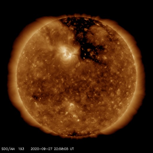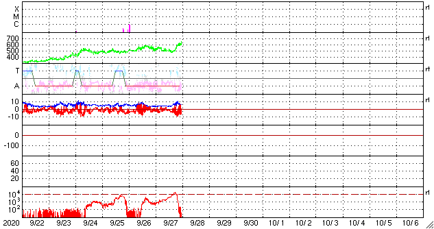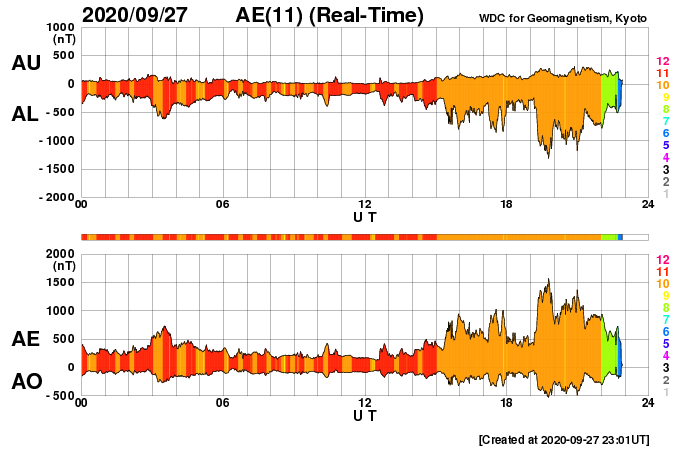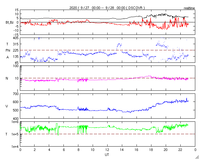 2020/ 9/28 08:11 更新 太陽風の速度は600km/秒へ高まっています。磁気圏の活動も活発です。 担当 篠原 500km/秒だった太陽風の速度は、 今日の早朝に600km/秒へ高まり、一段と高速の風になっています。 磁場強度は、速度が高まる頃に9nTへやや強まりましたが、 現在は6nTに下がり、平均的な状態に戻っています。 太陽風の速度は、 27日周期の図の前周期と同じ様に600km/秒へ高まりました。 前回はこの辺りが最高速度だったのですが、 今回は、SDO衛星AIA193の北半球の濃いコロナホールの影響が、 続いてやって来ると思われます。 速度はもう一段高まるかもしれません。 引き続き注目してください。 磁気圏の活動も高まっています。 AE指数は、グラフの後半で1000〜1500nTの大きな変化が続いています。 速度が高まるとともに、 磁場の南北成分が、-5nT程度の南向きになっているためです。 磁場の南向きの変化が続けば、磁気圏の活発な活動も続くでしょう。 太陽は、SDO衛星の可視光写真を拡大すると、 2773群の領域に小さい黒点が微かに見えている様です。 また、中央部の南半球側に、小さい黒点が新しく現れています。 SDO衛星AIA193で小さく光っている領域です。 この後、更に発達してはっきりと見える様になるでしょうか。 X線グラフは特に変化はありません。