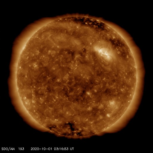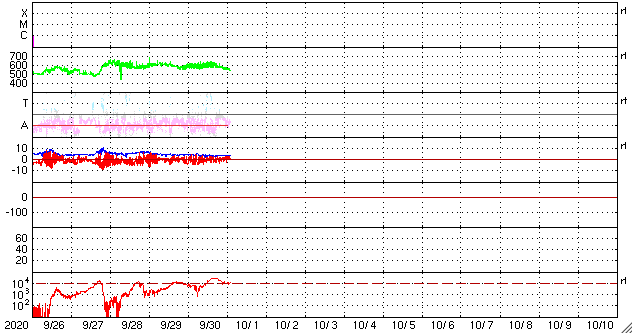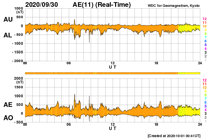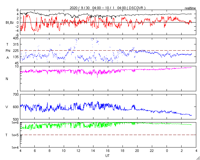 2020/10/ 1 12:35 更新 太陽風の速度は540km/秒に下がり、高速太陽風は終わりに近付いています。 担当 篠原 太陽風は、今日に入る頃までは600km/秒台が続いていましたが、 その後、ゆっくりと低下が始まり、現在は540km/秒になっています。 高速の状態は続いていますが、 高速太陽風は終わりに近づいている様です。 磁場強度は3〜4nTと、昨日からあまり変化していません。 南北成分は、グラフの中盤までは南北に小さく変化していますが、 その後は、変化が少なくなっています。 AE指数も、途中までは300〜500nT程度の 小規模の変化が続いていますが、 最後は変化が見られなくなっています。 太陽風速度の高まりが終わりに近付くにつれ、 磁気圏の活動も静かになっていくでしょう。 SDO衛星AIA193では、太陽の中央部にコロナホールはありません。 この後は、穏やかな太陽風が続きそうです。 太陽は無黒点です。 STEREO Ahead衛星で東端の向こう側を見ても、 目立つ領域は特にありません。 静かな太陽が続いています。 ![]() SDO衛星のAIA193カメラによる太陽コロナの様子 (c) SDO (NASA) ![]() SDO衛星による太陽の可視光写真 (c) SDO (NASA) ![]() DSCOVRが観測した太陽風の磁場(1番上の枠、黒線は全体の強度、赤線は南北成分) および、太陽風の密度(3番目の紫線)、速度(4番目の青線) (c) データ:NOAA/SWPC、作図:宇宙天気ニュース ![]() AE指数(速報値) 下段のAEグラフの値が高くなると、オーロラ活動が活発化しています。 (c) 京都大学WDC ![]() ![]() 27日の太陽周期に合わせたデータプロット 太陽が同じ面を地球に向けていた27日前の変化から、今後を予想することができます。 (c) 作図:宇宙天気ニュース