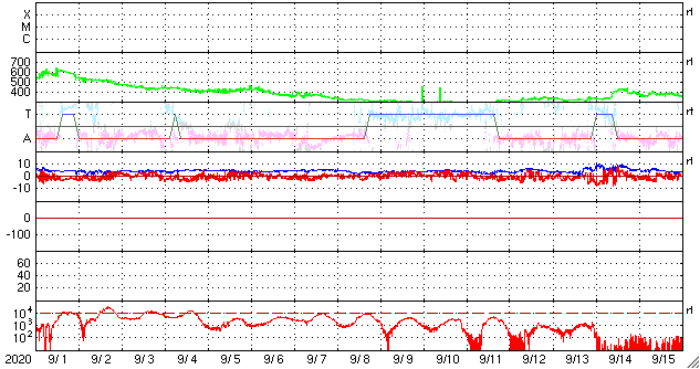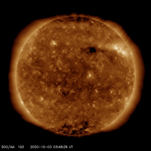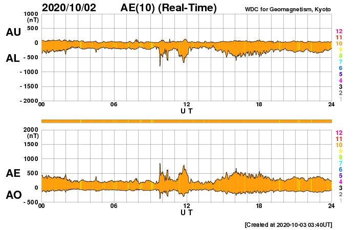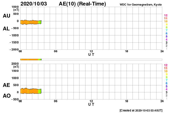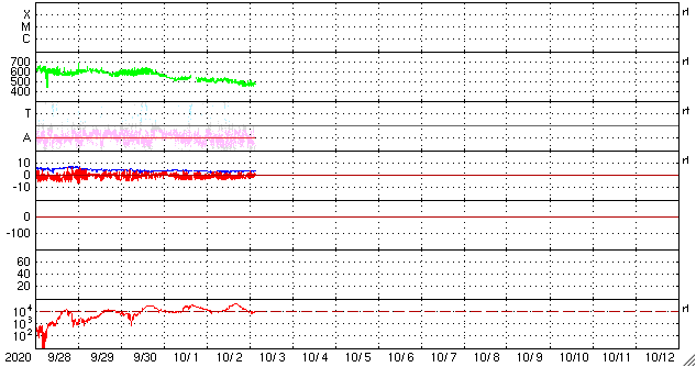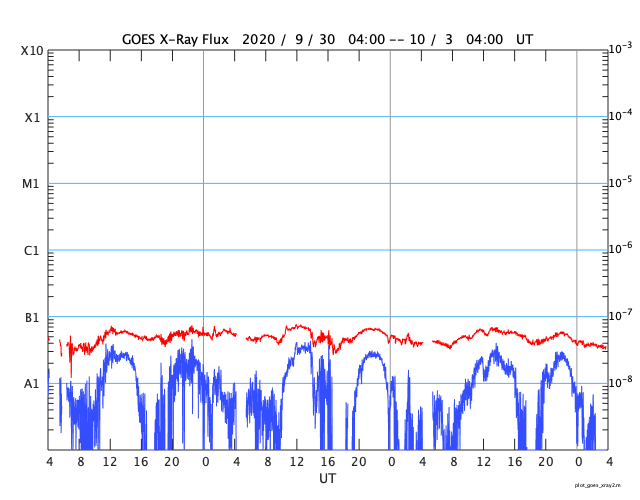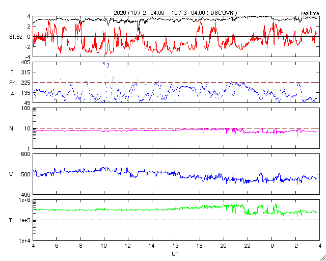 2020/10/ 3 12:59 更新 太陽風はやや高速程度に下がっています。太陽は無黒点です。 担当 篠原 太陽風の速度は470km/秒へ下がり、やや高速の状態になっています。 9月24日に始まった太陽風速度の高まりは、 終わりに近づいている様です。 太陽風の磁場強度は、3〜4nTで安定しています。 南北成分は、弱い南寄りの傾向が続いていて、 磁気圏はやや活動的です。 AE指数は、500nTに達する変化が時々発生しています。 SDO衛星AIA193の太陽コロナは、 全体的にぼんやりと光っていて、コロナホールはありません。 27日周期の図の前周期の様に、 この後、太陽風は低速風に変わりそうです。 太陽は無黒点です。 X線グラフも変化はなく、穏やかです。