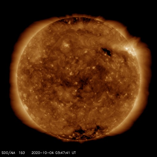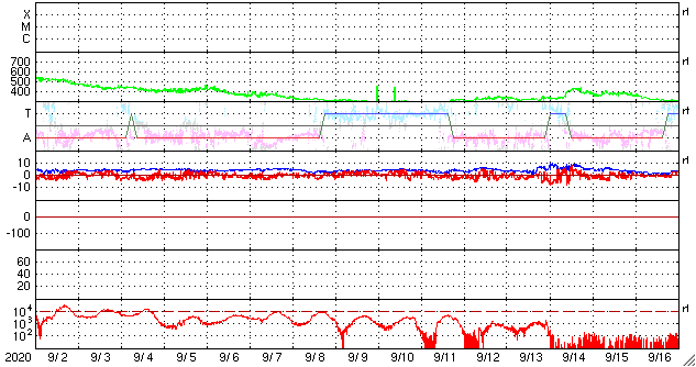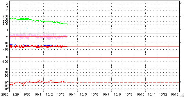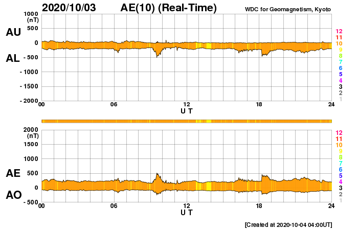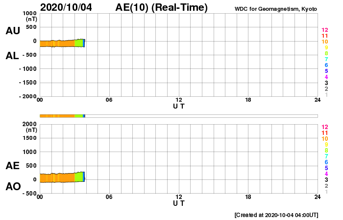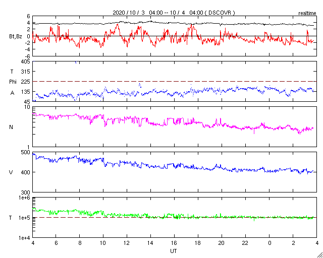 2020/10/ 4 13:01 更新 太陽風は平均的な速度に戻りました。磁気圏も穏やかになっています。 担当 篠原 太陽風の速度は400km/秒へ下がり、 平均的な速さに戻っています。 磁場強度は、3〜4nTとやや弱い状態です。 磁場の南北成分は小幅で南北に変化していますが、 速度が下がってきたため、磁気圏の活動は小さくなり、 AE指数は時々小規模の活動が見られる程度で、 全体的に変化は少なくなっています。 SDO衛星AIA193は、 太陽の中心に淡いコロナホールが見える程度で、 この後の太陽風は穏やかな状態がしばらく続きそうです。 27日周期の図を見ても、 前周期の太陽風は9月14日に少し高まった程度で、 その他は低速の風が続いています。 太陽は今日も無黒点です。 静かな状態が続いています。