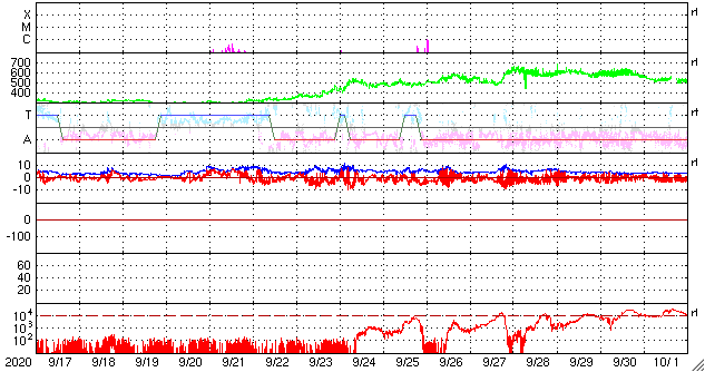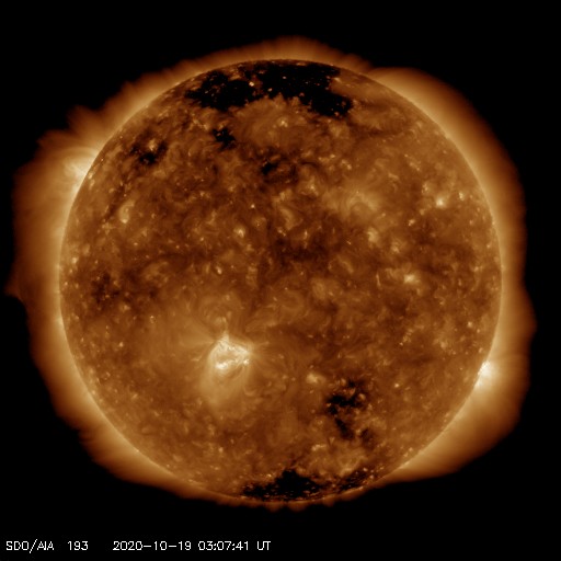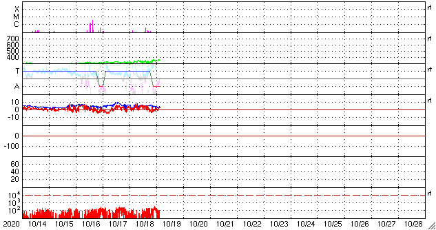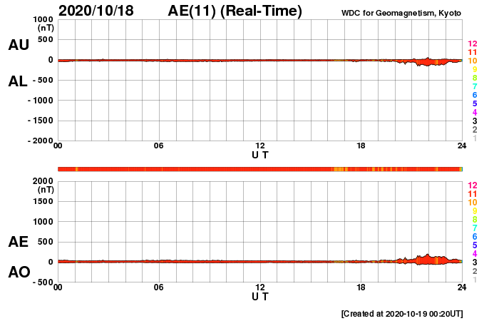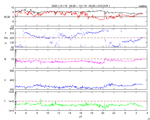 2020/10/19 12:29 更新 低速の太陽風が続いていますが、速度は350km/秒へ少し上がっています。 担当 篠原 太陽風の速度は、350km/秒へ少し上がっていますが、 低速の状態は続いています。 磁場強度は、5nTからグラフの最後は4nTへ少し下がっています。 磁場の南北成分は、北寄りの傾向が続いています。 磁気圏も穏やかで、 AE指数は、小さい変化が一度見られるだけで、 その他の時間帯は変化がありません。 27日周期の図を参照すると、 太陽風速度はこれから次第に高まって行く可能性があります。 磁場強度の変化も参考にしながら、速度の変化に注目してください。 前周期は、高速の太陽風が10日にわたって続きました。 今回はどの様な高まりになるでしょうか。 太陽は、2776黒点群でB4.0など Bクラスの小さいフレアが数回発生しています。 X線グラフでは活動が強まる様子はありませんが、 この後どうなるでしょうか。