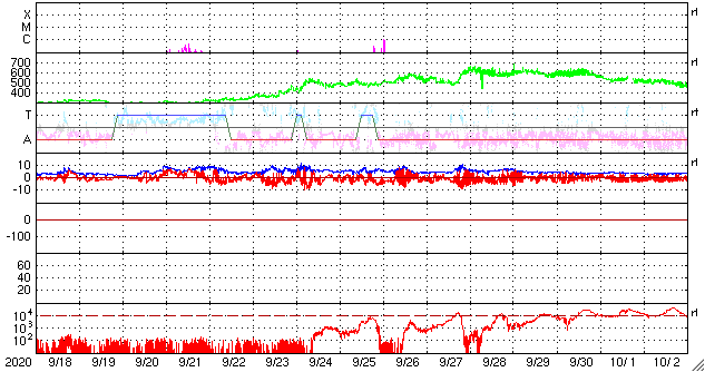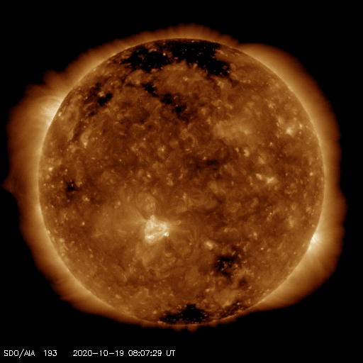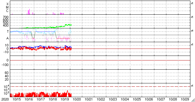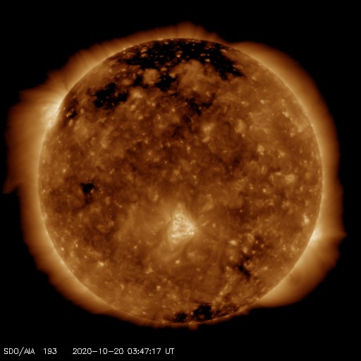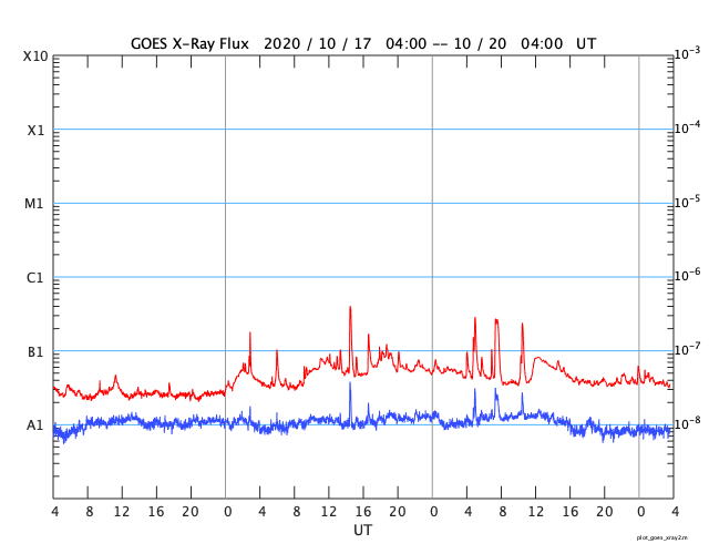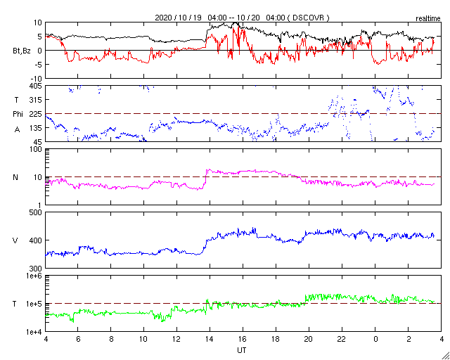 2020/10/20 12:55 更新 太陽でコロナの弱い噴出が発生しています。太陽風は平均的な状態です。 担当 篠原 昨夜、10月19日21時(世界時19日12時)頃に、 太陽の中央部の2776黒点群でA8の小さいフレアが発生しました。 SDO衛星AIA193の動画を見ると、 このフレアに伴ってコロナのガスが飛び出している様です。 この噴出による太陽風の乱れが、 3~4日ほどかけて地球に到来する可能性があります。 弱い噴出なので、 太陽風磁場が強まる様な変化が見られるのではないでしょうか。 この場合、磁場が南向きに強まると, オーロラの活動が一気に高まる可能性があります。 しばらく注目してください。 2776黒点群では、この他にもB1~2の小さいフレアが数回発生しています。 フレアの活動としては、この規模で安定しています。 太陽風は、19日23時(世界時19日14時)頃に一段強まって、 速度は350km/秒から420km/秒に、 磁場強度は5nTから9nTに、それぞれ変化しています。 磁場強度はその後5nTに下がり、 速度、磁場強度ともに平均的な状態になっています。 27日周期の図を見ると、 前周期と同じ様なタイミングで高まりが発生しています。 この後、高速風へ変化するでしょうか。 太陽風磁場の南北成分は、南北に変化する様になっています。 AE指数のグラフは現在停止していますが、 他の指数を参照すると、磁気圏では小規模の活動が発生している様です。 ![]() 2776黒点群で発生したA8フレアの様子。SDO衛星AIA193。 (c) SDO (NASA)、(動画加工 : 宇宙天気ニュース) ![]() SDO衛星のAIA193カメラによる太陽コロナの様子 (c) SDO (NASA) ![]() SDO衛星による太陽の可視光写真。マウスの矢印を写真に重ねると、黒点番号付きの写真に切り替わります。 (c) SDO (NASA) ![]() GOES衛星の太陽X線強度。赤・橙 = 0.1〜0.8 nm、青・紫 = 0.05〜0.4 nm (c) データ:NOAA/SWPC、作図:宇宙天気ニュース ![]() DSCOVRが観測した太陽風の磁場(1番上の枠、黒線は全体の強度、赤線は南北成分) および、太陽風の密度(3番目の紫線)、速度(4番目の青線) (c) データ:NOAA/SWPC、作図:宇宙天気ニュース ![]() 27日の太陽周期に合わせたデータプロット 太陽が同じ面を地球に向けていた27日前の変化から、今後を予想することができます。 (c) 作図:宇宙天気ニュース