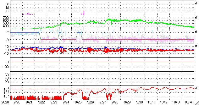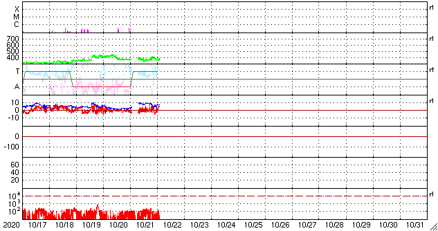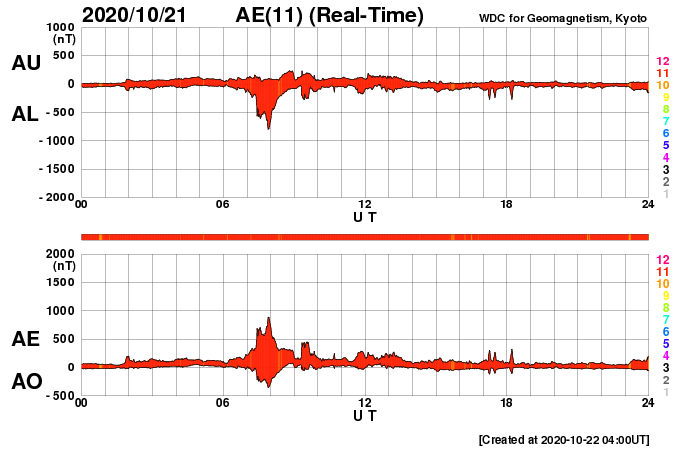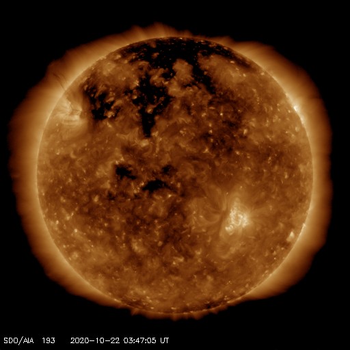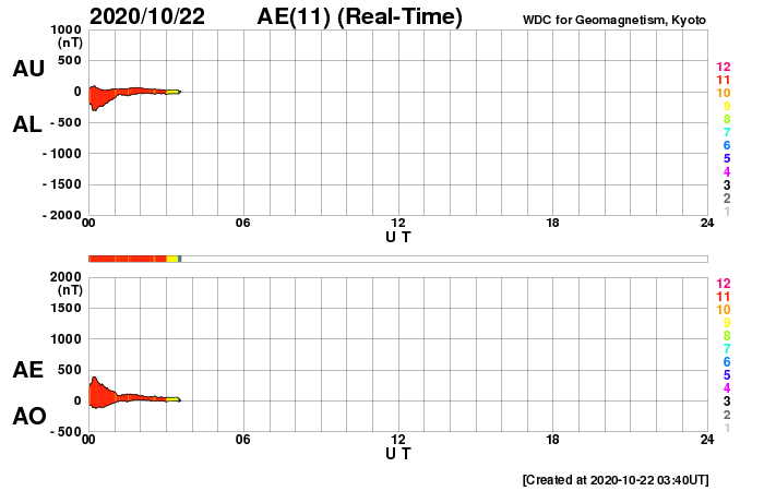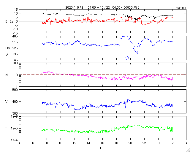 2020/10/22 13:01 更新 太陽風は低速の状態で、磁気圏も概ね静穏です。 担当 篠原 太陽風は、350~400km/秒と低速の風が続いています。 磁場強度は、昨日のニュースの頃に10nTに強まっていた様です。 その後は次第に低下して、 現在は7nTと平均的な値に戻りかけています。 AE指数は、700nTと中規模の変化が1回発生していますが、 その後は小さい変化に留まっています。 磁気圏は概ね静穏です。 27日周期の図を見ると、 前周期の太陽風は既に500km/秒の高速風になっています。 今回はどこから速度の高まりが始まるでしょうか。 SDO衛星AIA193では、太陽の北半球側にコロナホールが見えています。 今後、この領域の影響が到来するのではないでしょうか。 太陽は、2776黒点群が南西側に見えているだけです。 X線グラフの変化はなく、穏やかな状態です。