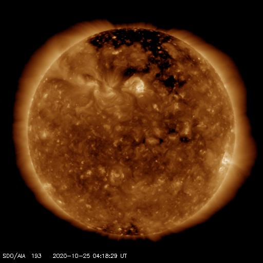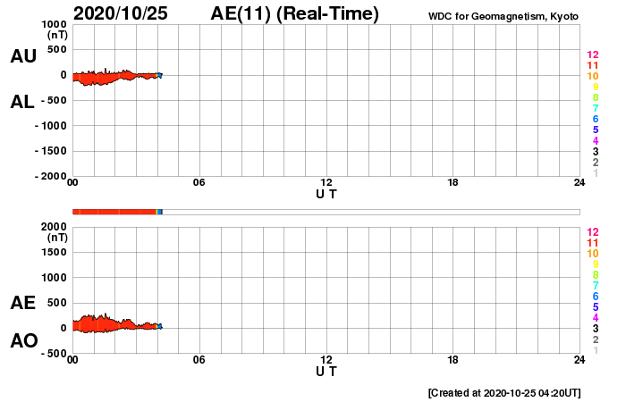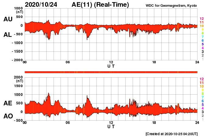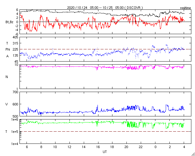 2020/10/25 13:24 更新 高速の太陽風が続いています。磁気圏も活動的な状態が続きました。 担当 篠原 高速の太陽風が続いています。 速度は、530km/秒から550km/秒へ少し上昇しています。 磁場強度は、4nT前後と平均的な状態です。 磁場の南北成分は、昨日のニュースの後に再び南寄りに変わり、 -2nT前後の南向きの変化が続きました。 このため、AE指数では500~800nTの中規模の変化が発生しています。 そして、今日未明からは(世界時24日18時頃)、 南北成分は0nTを挟んで南北に小幅で変化する様になり、 AE指数のグラフも後半は200nT程度の小さい変化に変わっています。 SDO衛星AIA193では、 北半球の中緯度域にコロナホールが見えています。 27日周期の図の前周期の太陽風は、 もう5日ほど高速の状態が続いています。 太陽の2776黒点群は、南西の端に近付いています。 今朝、25日6時(世界時24日21時)に、 B2.3の小さいフレアを起こしています。 STEREO Ahead衛星を参照すると、 太陽の東端の向こう側に活動的な領域は見られない様です。 2776群が沈むと、太陽は無黒点になるかもしれません。 ![]() SDO衛星のAIA193カメラによる太陽コロナの様子 (c) SDO (NASA) ![]() SDO衛星による太陽の可視光写真。マウスの矢印を写真に重ねると、黒点番号付きの写真に切り替わります。 (c) SDO (NASA) ![]() DSCOVRが観測した太陽風の磁場(1番上の枠、黒線は全体の強度、赤線は南北成分) および、太陽風の密度(3番目の紫線)、速度(4番目の青線) (c) データ:NOAA/SWPC、作図:宇宙天気ニュース ![]() AE指数(速報値) 下段のAEグラフの値が高くなると、オーロラ活動が活発化しています。 (c) 京都大学WDC ![]() ![]() 27日の太陽周期に合わせたデータプロット 太陽が同じ面を地球に向けていた27日前の変化から、今後を予想することができます。 (c) 作図:宇宙天気ニュース