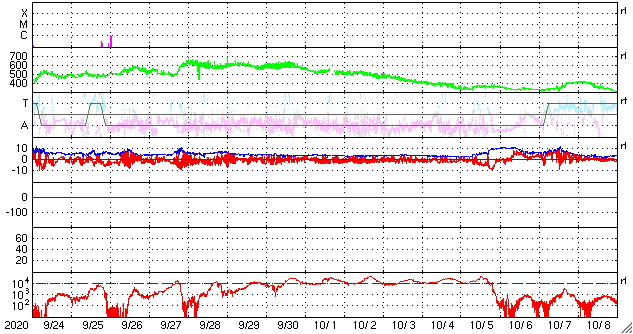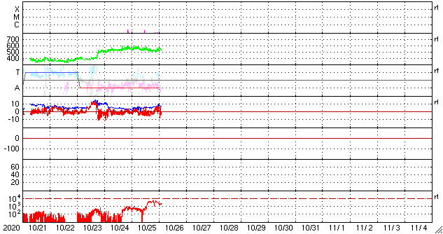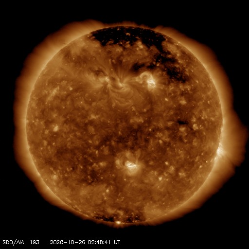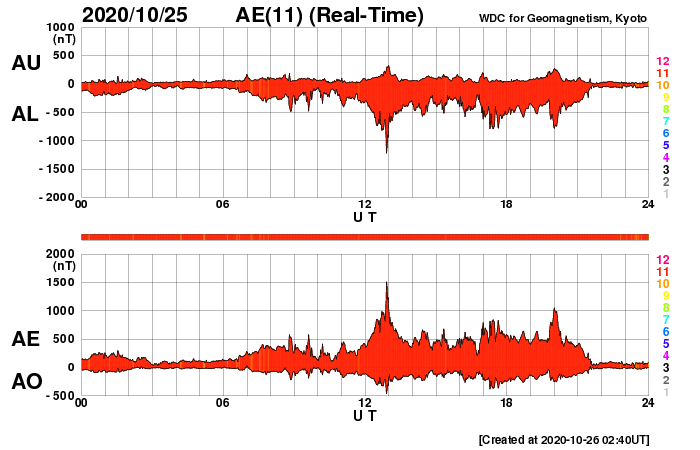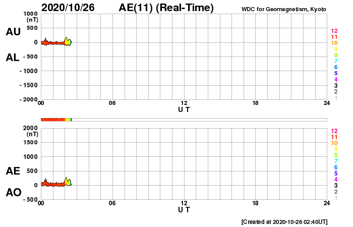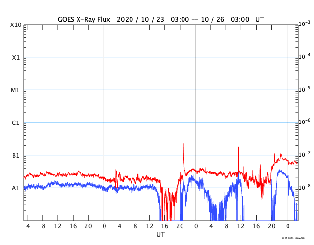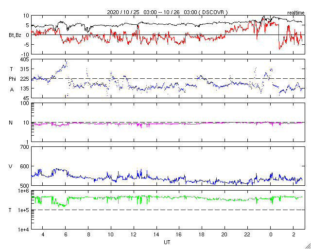 2020/10/26 11:59 更新 太陽に新しい黒点が現れています。高速の太陽風が続いています。 担当 篠原 昨日の午後くらいから、 太陽の南半球の中央部に黒点発生しました。 現在の写真では、東西方向に広がっています。 X線グラフは、全体の強度が少し高まり、 新しい黒点の領域では、小さい活動も発生しています。 活動の規模は高まるでしょうか。 この後の推移に注目してください。 一方、2776黒点群は、西の端に達していて、 沈みかけています。 太陽風は、速度が550km/秒から530km/秒に少し下がっていますが、 高速の状態は続いています。 磁場強度は、5nT程度と平均的な状態が続いています。 グラフの最後で少し高まっていますが、すぐに戻りそうです。 磁場の南北成分は、グラフの中盤まで南寄りが続き、 その後一旦北に向いて、最後は再び南寄りになっています。 AE指数も、グラフの途中までは 500~1000nTの中規模の変化が続いていますが、 終わり頃は静かになっています。 太陽風のグラフで磁場が再び南寄りになっているので、 この傾向が続けば、磁気圏の活動も再び高まるでしょう。 SDO衛星AIA193では、北半球のコロナホールは、 全体的に西半球側に進んでいます。 高速の太陽風は後半に入りそうです。 ![]() SDO衛星のAIA193カメラによる太陽コロナの様子 (c) SDO (NASA) ![]() SDO衛星による太陽の可視光写真。マウスの矢印を写真に重ねると、黒点番号付きの写真に切り替わります。 (c) SDO (NASA) ![]() GOES衛星の太陽X線強度。赤・橙 = 0.1〜0.8 nm、青・紫 = 0.05〜0.4 nm (c) データ:NOAA/SWPC、作図:宇宙天気ニュース ![]() DSCOVRが観測した太陽風の磁場(1番上の枠、黒線は全体の強度、赤線は南北成分) および、太陽風の密度(3番目の紫線)、速度(4番目の青線) (c) データ:NOAA/SWPC、作図:宇宙天気ニュース ![]() AE指数(速報値) 下段のAEグラフの値が高くなると、オーロラ活動が活発化しています。 (c) 京都大学WDC ![]() ![]() 27日の太陽周期に合わせたデータプロット 太陽が同じ面を地球に向けていた27日前の変化から、今後を予想することができます。 (c) 作図:宇宙天気ニュース