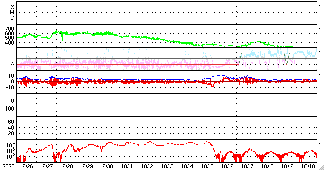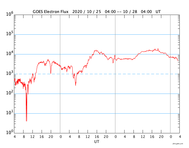 2020/10/25 13:24 高速の太陽風が続いています。磁気圏も活動的な状態が続きました。