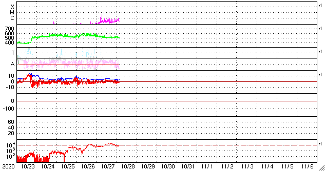2020/10/27 12:41 太陽でフィラメント噴出が発生しています。550km/秒の高速太陽風が続いています。