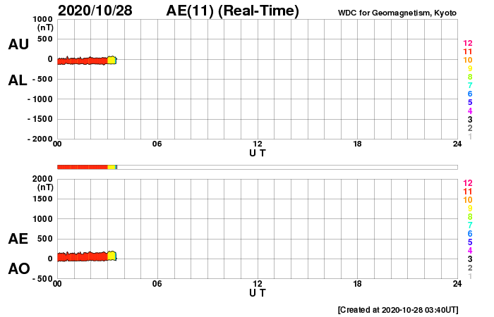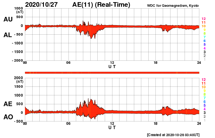 下段のAEグラフの値が高くなると、オーロラ活動が活発化しています。